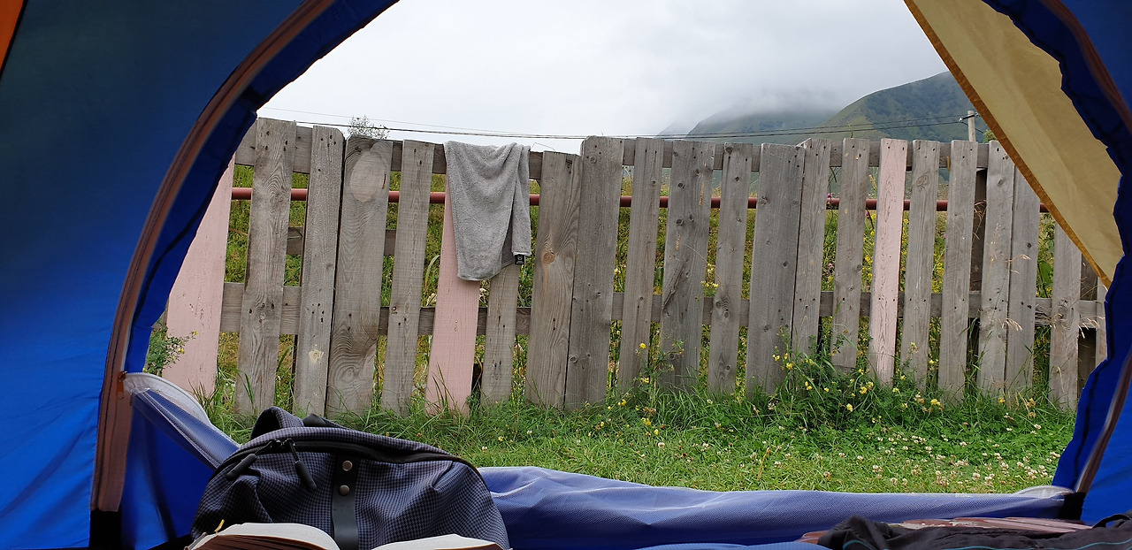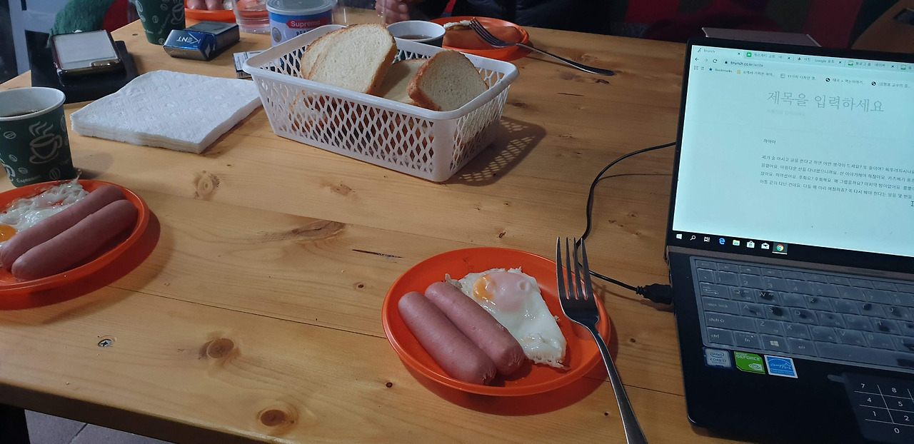 속도 부대끼는데 먹긴 또 뭘 먹어? 달걀 프라이가 지글지글, 향기가 간질간질. 누군가의 아침 식사를 빤히 바라만 보기는 또 싫고. 그래서 숙소 조식을 주문. 10라리(4천 원). 소시지 두 개(싸구려 느낌), 달걀 한 알(두 알도 아니고). 차가 같이 나오길래 포함인 줄 알았더니 차는 또 3라리(천 2백 원). 거참 숙소 사장 장사 못하는구려. 텐트에서 싸게 재워주고(15라리 6천 원), 이런 걸로 남겨야 하는 건 알지만 말이오. 오이, 토마토라도 몇 조각 썰어 주지 그래요. 차는 그냥 줘도 될 것 같은데. 빈속에 글도 써야지, 이따위 아침 식사도 용서해야지. 참 자비 없는 아침이구려.