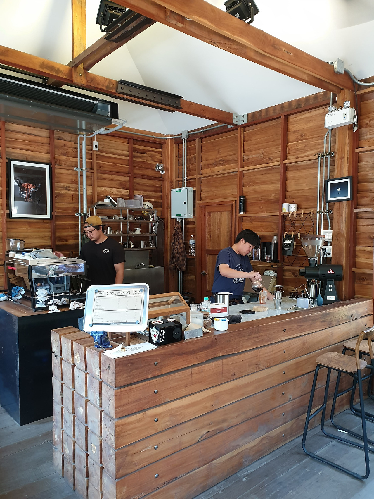 우리는 열심히 정보를 검색해요. 맛집, 카페가 이미 머릿속에 가득해요. 그곳들은 연예인이 되죠. 연예인의 실물을 영접하러 갑니다. 화면발과 실물이 얼마나 다를까요? 마음속 연예인을 만져보고, 느껴볼 수 있어요. 맛집 탐방의 재미죠. 제가 추천하는 곳은 연예인 지망생쯤이라고 해두죠. 저에게는 그냥 우연이지만, 여러분께는 연예인이 될 수도 있겠어요. 더울 때, 커피였으면 했을 때 지나쳤던 작은 카페예요. 배낭 여행자들이 바글바글한 타페 게이트에서 바로예요. 남자 둘이 커피를 우려요. 아이스라테를 시켰죠. 더웠어요. 에어컨 냉기 덕분에요. 살겠다. 안심합니다.