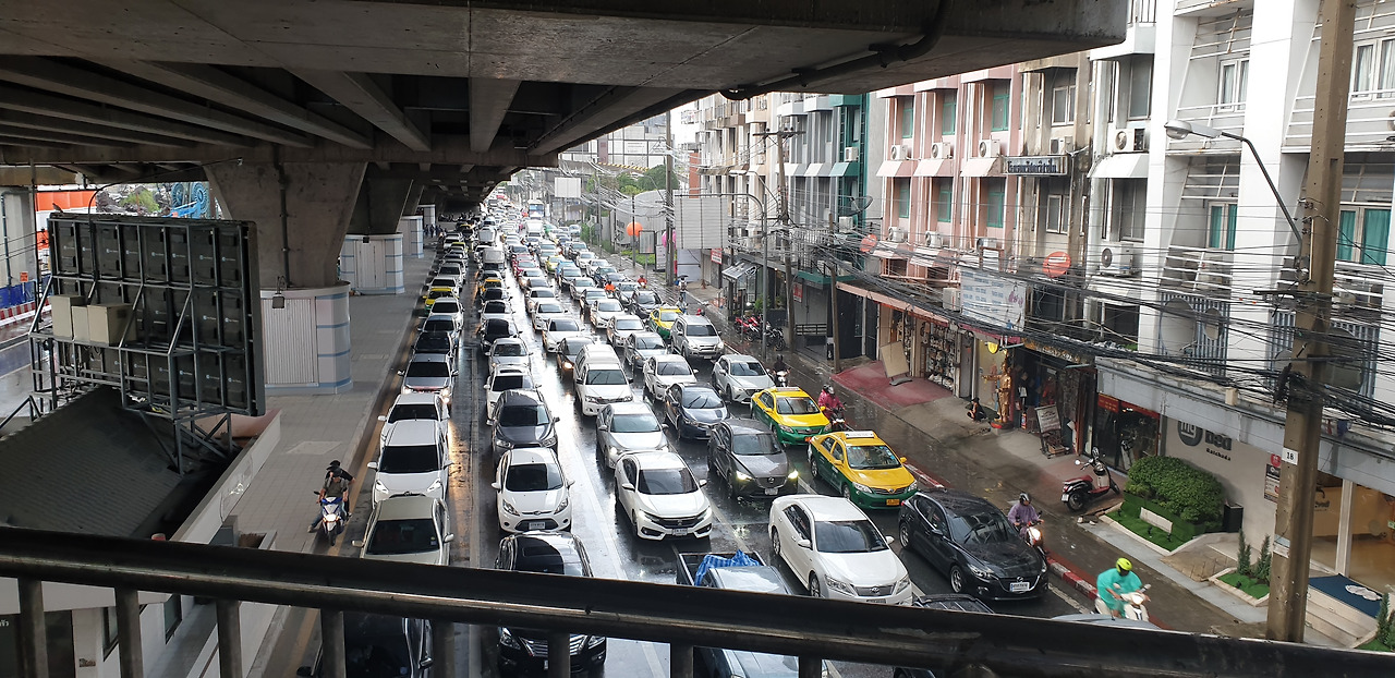 구질구질, 추적추적. 갑자기 비가 오네요. 오늘 마사지에 큰돈 썼잖아요. 버스를 타고 집으로 가려고 했죠. 버스가 제일 싸거든요. 차 막히는 거 보셨죠? 돈도 아낄 때 아껴야죠. 그래서 BTS, MRT. 지하철과 지상철을 타요. 방콕엔 환승 같은 거 없습니다. 따로, 따로 내야 해요. 총 천 삼백 원 정도 썼습니다. 그래도 또 마을버스나 오토바이 택시를 타긴 타야 해요. 차라리 택시를 타라고요? 막히는 거 보셨죠? 돈 때문이 아니라요. 오늘 집에 들어가고 싶어서, 이렇게 복잡하게 가는 겁니당.