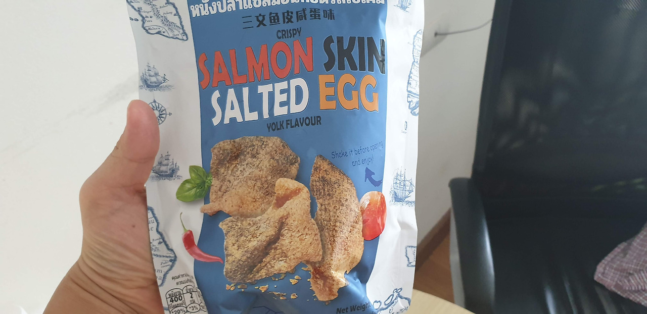 이렇게 고급스럽게 느끼한 과자는 또 처음이네요. 염장한 계란이라고 해야 하나요? 짜디짠 달걀을 말리고, 갈아서 연어 껍질 튀김 위에 곱게 펴 발랐어요. 고소함이 버터와 치즈에 오징어 땅콩을 버무린 것 이상입니다. 생선 껍질 특유의 비린내가 일단 안 나더라고요. 저는 태국의 이마트라고 할 수 있는 Big C에서 샀네요. 한 번 맛본 사람들은 수십 봉지씩 사갈 걸 확신합니다. 알코올 중독자의 길로 들어설 수도 있어요. 술을 부르는 안주 월드컵에서 3번 연속 우승했답니다. 네, 헛소리입니다. 그만큼 맛있습니다. 고급스럽게 느끼하고, 우아하게 짠맛은 요게 최곱니다.