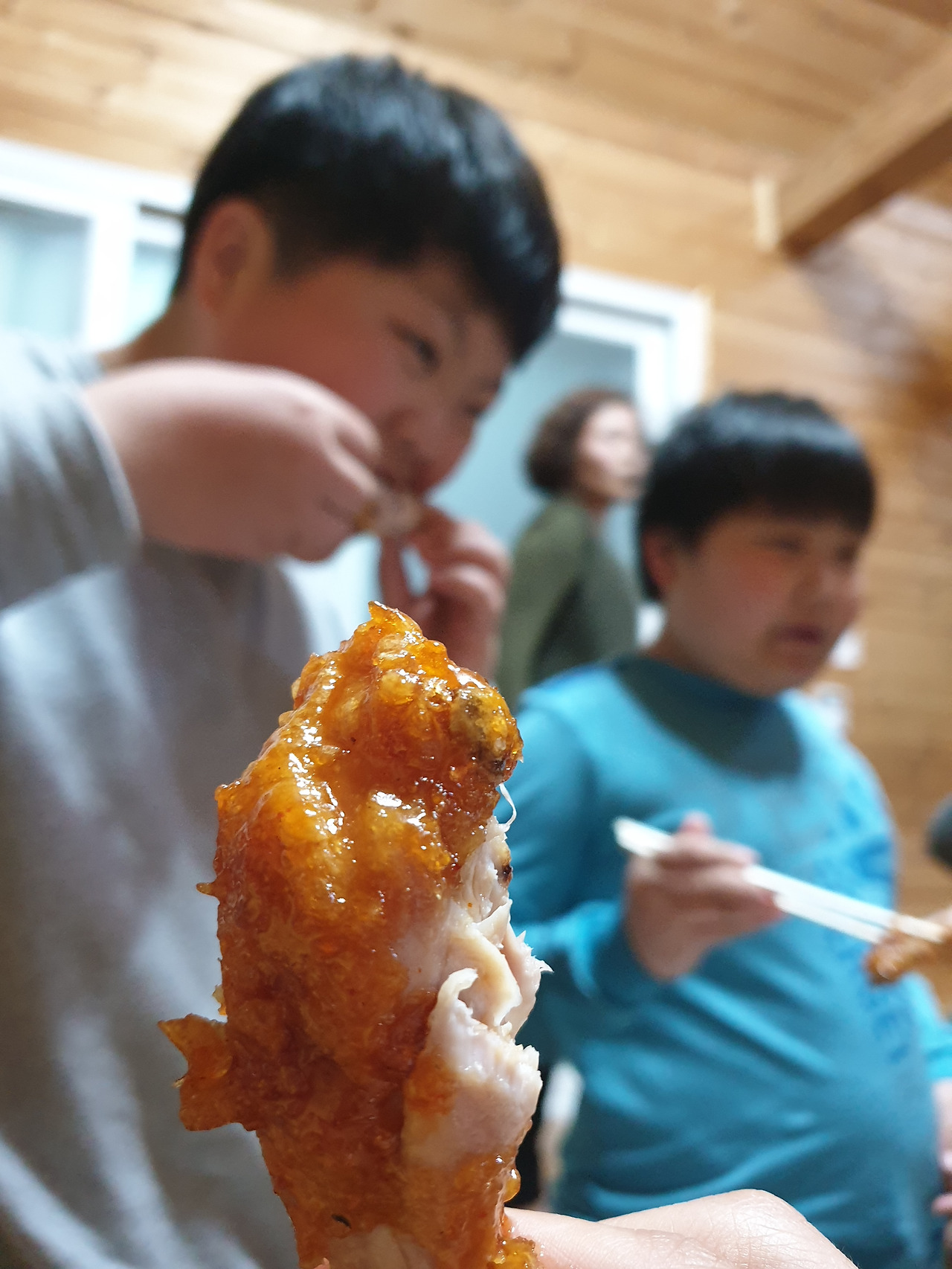집에서 가져온 반찬에 부산 명물 다리집 떡볶이, 김밥이 올라온다. 나만 모르는 대세 오징어 '꽃보다 오징어'에 칭다오를 마신다. 호식이 두마리 치킨이 두 세트. 후라이드, 갈릭양념, 간장치킨,양념치킨. 밥을 멀쩡히 먹고, 이걸 또 다 먹는다. 펩시 콜라가 아니어서 아이들은 실망한다. 코카콜라가 되려 찬밥이다. 또 한 번 충격을 받는다. 성훈이가 다리를 내게 건넨다. 중1이 어른에게 치킨의 다리를 양보했다.