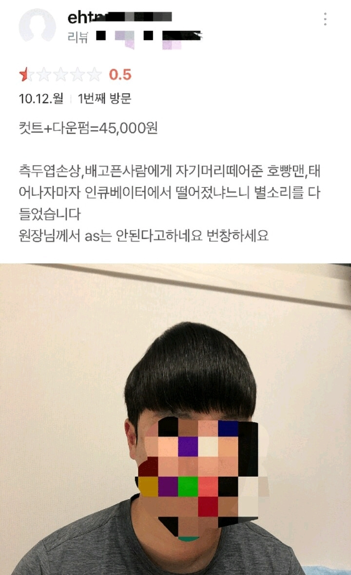인터넷에서 난리가 난 사진이에요. 제가 충격을 받은 건 '난리'가 났다는 거예요. 처음엔 이상하다는 것조차 눈치를 못 챘어요. 측두엽 손상이란 말도 이해를 못 했고요. 다운펌을 했는데 찌그러졌다는 걸 이제는 알겠어요. 위만 볼록하고, 옆이 찌그러지기는 했네요. 하지만 깜짝 놀랄 만큼, 세상 사람들이 한결 같이 어이없어할 만큼 망친 머리라는 걸 전혀 못 받아들이겠어요. 헤어 디자이너이자 유튜버 금강연화가 화제의 주인공을 다시 다듬어서 오른쪽 머리로 만들어 줘요. 오른쪽 머리도 자고 일어나면, 왼쪽 머리 되는 거 아닌가요? 저라도 왼쪽 머리면 화나죠. 다운펌을 왜 하겠어요? 전국구급 화제성이 있느냐는 거죠. 나라면 가만 안 놔둔다. 당장 환불받아라. 인터넷을 뜨겁게 달군 그 지점을 저는 이해할 수 없어요. 솔직히 바가지 머리가 국민 머리일 때부터, 약간 웃겼거든요. 웃긴 게 최고지. 자신의 머리를 개그로 승화시켜서 이웃과 친구에게 기쁨을 주려는 걸로 해석했어요. 그 바가지도 완성형이 있고, 망친 형이 있다는 게 사실은 더 충격이에요. 완벽한 곡선의 바가지는 '아름다움'이란 걸 오늘에야 알았어요. '웃김'은 한 스푼도 없는 진지함이었다니. 환불을 거절한 원장님에게도 그래서 분노하지 않았어요. 다운펌 할 때 재료도 꽤나 썼을 테고, 자신의 노동도 공짜는 아니니까요. 돈을 돌려준다는 건, 원장으로서 자존심 문제기도 하니까요. 이 일로 난리가 나자, 원장은 환불을 해줘요.