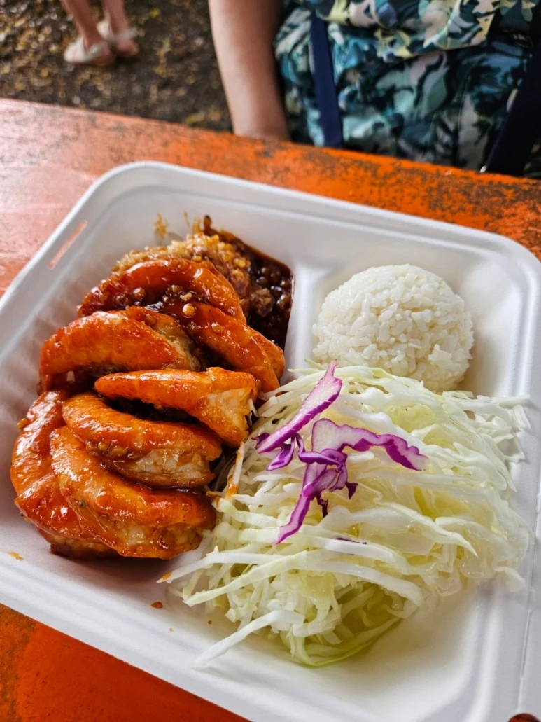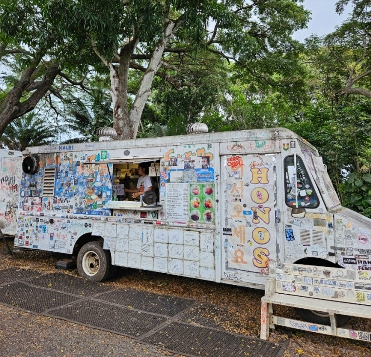 첫째 날 우리는 오아후섬 북쪽 노스쇼어의 할레이와로 향했다. 석진이와 윤기와 정국이가 방문한 호노스 새우 트럭에 가기 위해서였다. 방탄이 시킨 대로 메뉴판에서 1번 3번 6번을 주문하고 둘러보니 방탄 사인이 있었다.