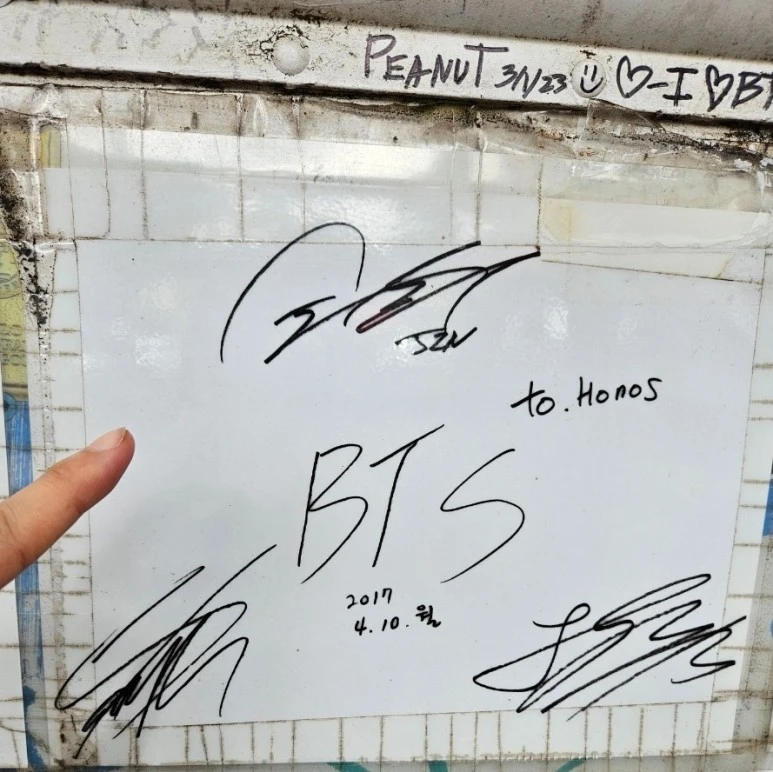 나는 직원분께 여기 방탄이 왔었냐. 왔을 때 어디에 앉았냐. 물어봤다. 좌석 배치가 바뀌어서 그 자리가 없다고 하셨다. 뿌앵. 호노스 앞에서 수십 장의 사진을 찍었다. 트럭이랑도 찍고 방탄 사인이랑도 찍고. 그랬더니 뭐 유명한 곳인가? 사람들이 나를 구경했다. 즐거웠다. 여기에 방탄의 숨결이 약간은 남아있지 않을까 생각하며 킁킁댔다.