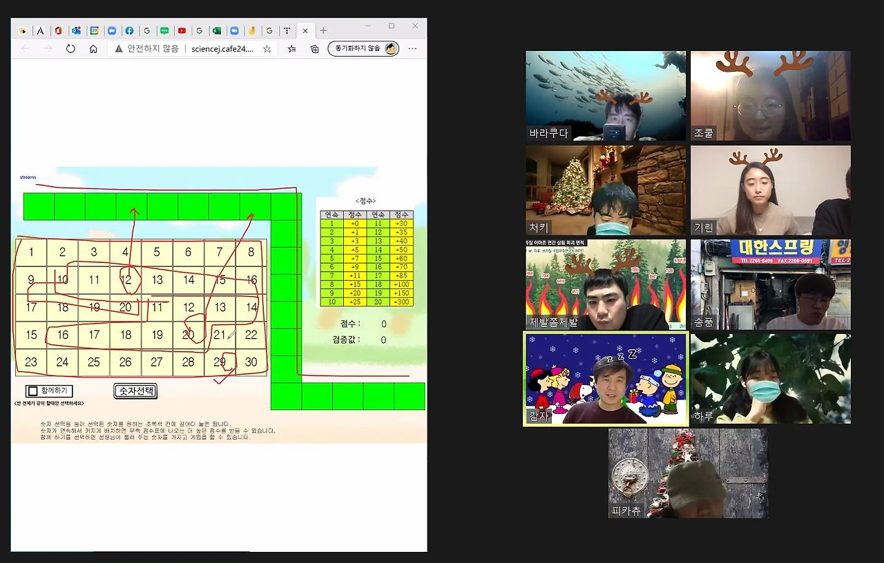 숫자 오름차순을 이용한 빙고 게임인데, 시트지를 미리 출력해서 온라인으로 즐기는 방법도 있었지만 출력도 번거로운 일이라 과학 선생님께서 웹에서 직접 스트림스를 실행할 수 있게 만들어 준 사이트에서 진행하였습니다.