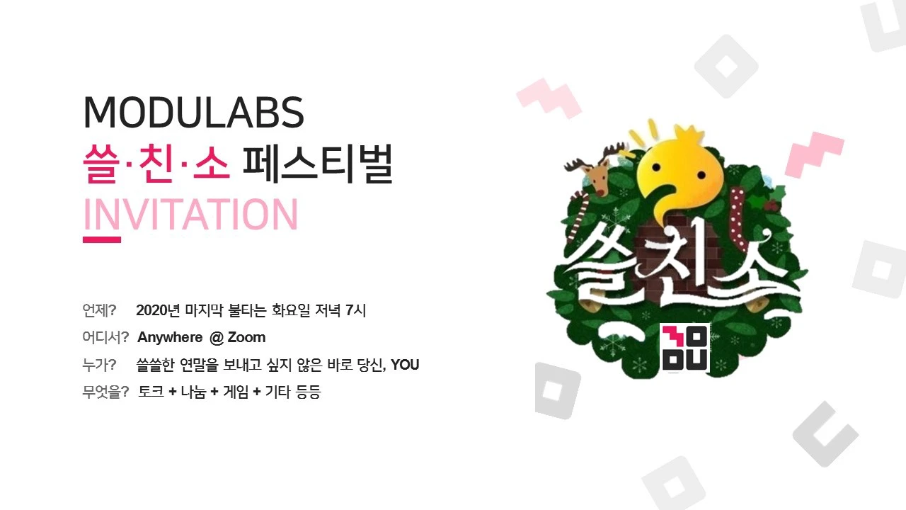 모두의연구소에 정식 입사하기 전 마케팅 TF와 겨울 유배에 참여해서 앞으로 어떤 일을 해야 할지에 대해 논의하는 시간을 갖고 있었던 때, 모두연 팸분들과 랜선 파티라도 소소하게 해보고 싶다는 생각이 들었습니다.