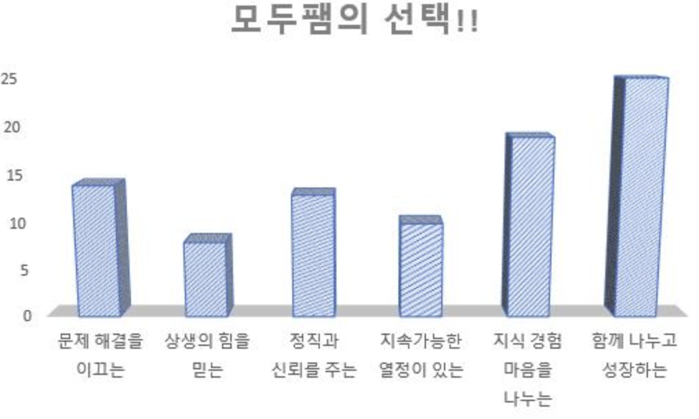 모두의연구소 사원증에는 모두연이 지향하고 있는 철학 및 가치와 관련된 6가지 문장 중에 하나를 각자 택할 수 있습니다. '함께 나누고 성장하는'을 선택한 팸들이 가장 많네요!