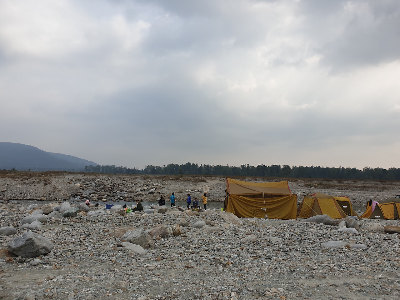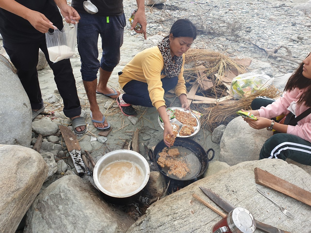 강가에는 돌들이 많았는데 인도 친구들은 큰 돌들을 바람막이 삼아서 요리를 했다. 가져온 세 개의 텐트가 다 쳐지고 지난달에 인도 쇼핑몰에서 산 접이식 테이블도 펴 놓고 제대로 모습이 갖춰 줬을 때쯤 점심 겸 저녁이 준비되었다.