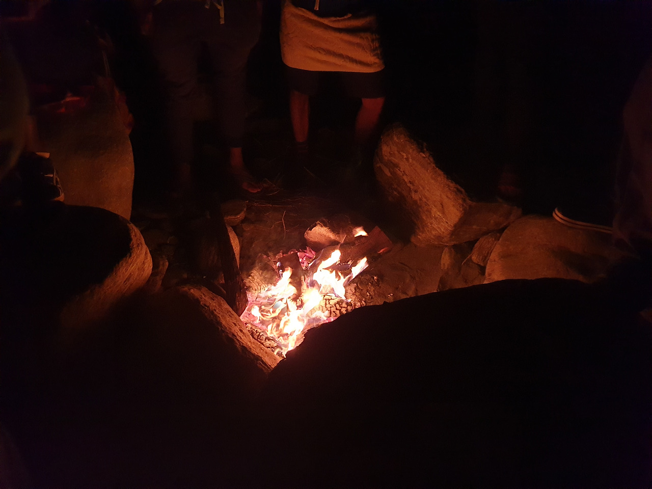 저녁이 되자 모두 모닥불을 피워 놓고 주위에 모였다. 산 중간중간에 있는 집들에서 나오는 불빛과 밤하늘의 달과 별빛만 비췄다. 준비해 갔던 간식거리와 음료수를 나눠 먹으면서 우리는 늦은 밤까지 이야기를 나누었다.