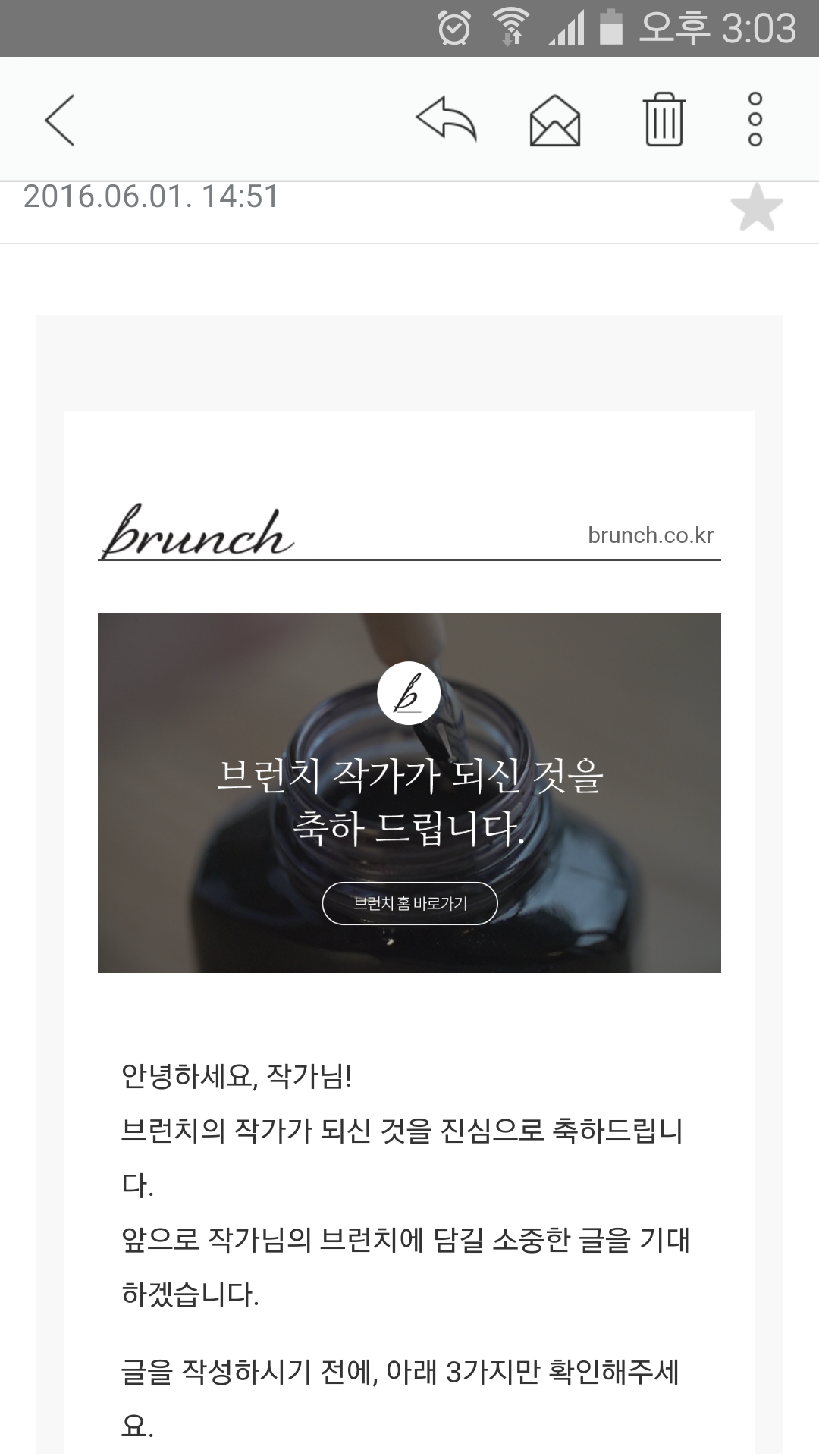 나는 브런치 소식이 오면 일단 즉시 확인하지 않는다. 핸드폰 위쪽에 뜨는 브런치 아이콘이 너무 사랑스러워 두고두고 본다. 오래된 깃털 펜을 연상 시키는 브런치의 아이콘은 그 모양만으로도 브런치를 표현하고 있었다.(어떤 디자이너가 아이디어를 낸 것인지 몰라도 정말 사랑스러운 아이콘이다.)