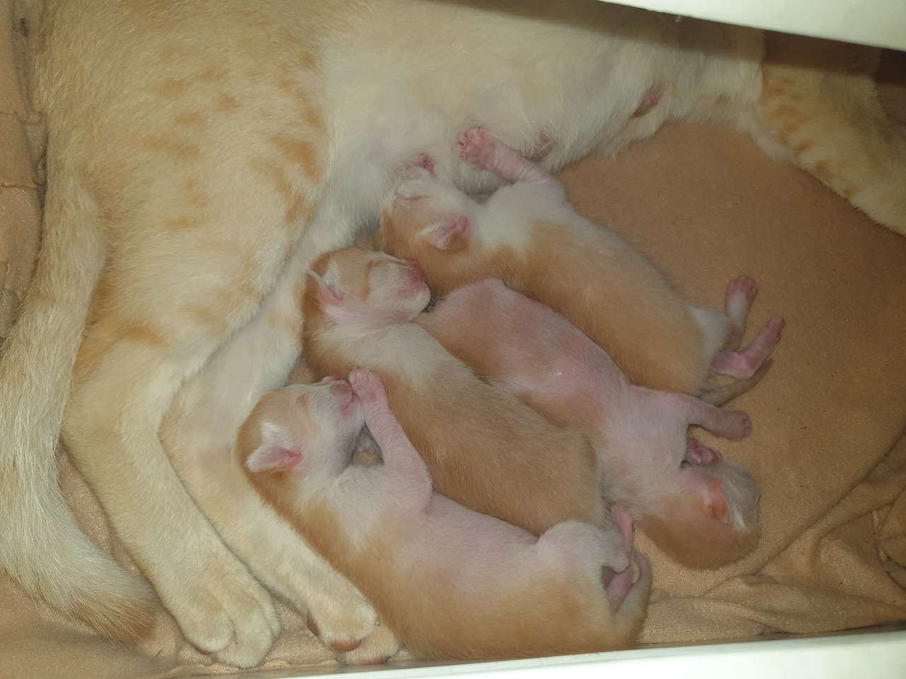 첫 아이를 낳을 때 엄마가 내 곁에서 내 배를 만져 주었던 것처럼 말이다. 꼭 내가 라씨의 엄마가 된 것만 같았다. 그렇게 3시간에 걸쳐 라씨는 4마리의 새끼를 낳았다. 라씨처럼 모두 오렌지 색이었다. 꿈틀거리는 새끼의 탯줄을 모두 먹고 피 묻은 아기 고양이의 몸을 깨끗하게 핥아 주는 라씨는 어느새 어엿한 엄마가 되어 있었다.