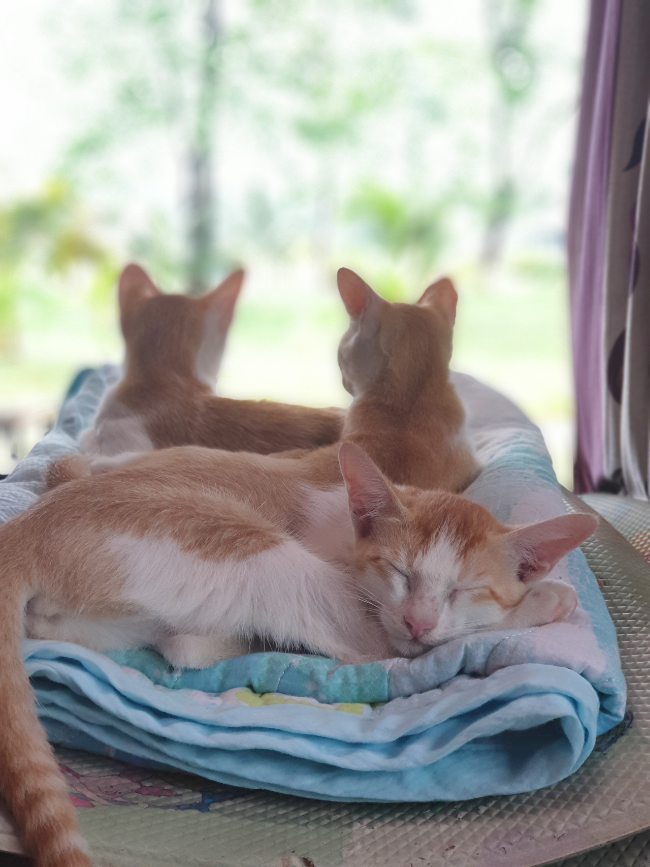 아기 고양이 아니 청소년 고양이들도 이제 엄마를 따라서 자주 바깥세상 구경을 한다. 우리 집 고양이 가족들은 낮에는 주로 풀밭에서 따스한 햇볕을 받으며 낮잠을 자거나 집 안의 폭신한 이불 위나 배게 위에서 잠을 잔다.