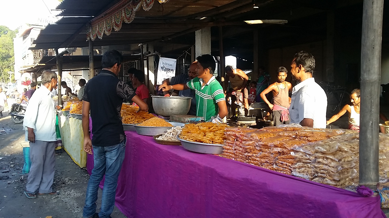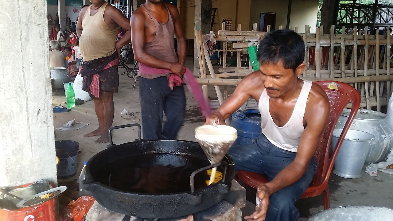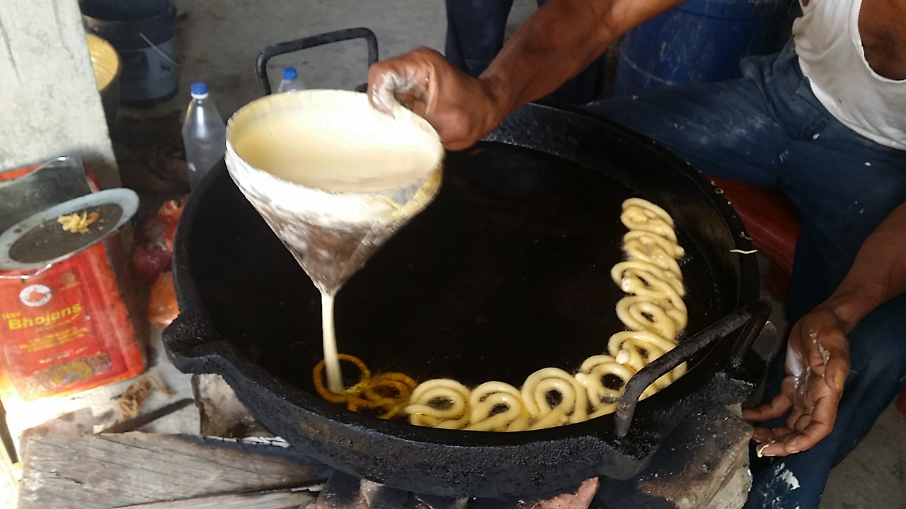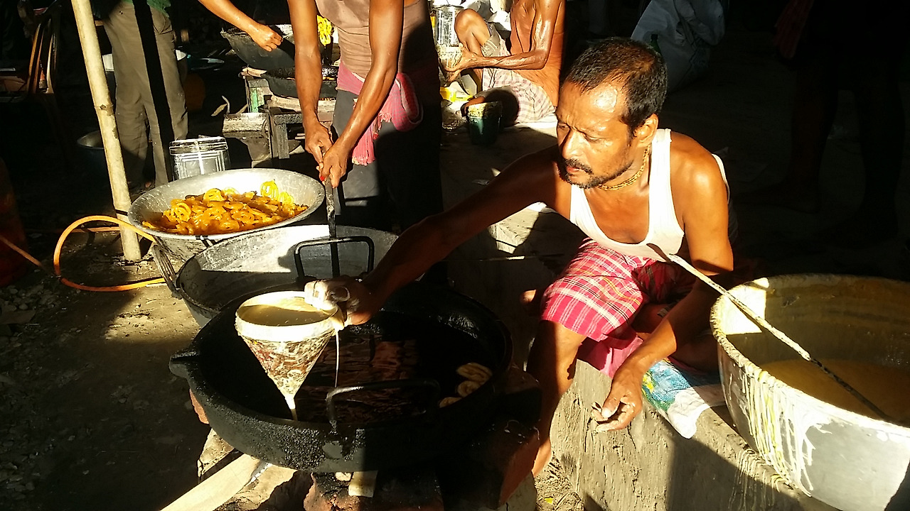 시장에 들어서자마자 첫 번째로 눈에 띈 것이 바로 스윗을 파는 가게였다. 인도 웨스트 벵갈 주의 대표 음식인 스윗(설탕과 밀가루 때론 우유로 만든 인도만의 달콤한 음식)은 어느 집을 방문해도 식사 후 대접하는 후식으로 유명하다. 오늘은 그 스윗들 중에서도 젤러비를 시장 거리 밖에서 만들어 파는 모습을 보여주었다.
