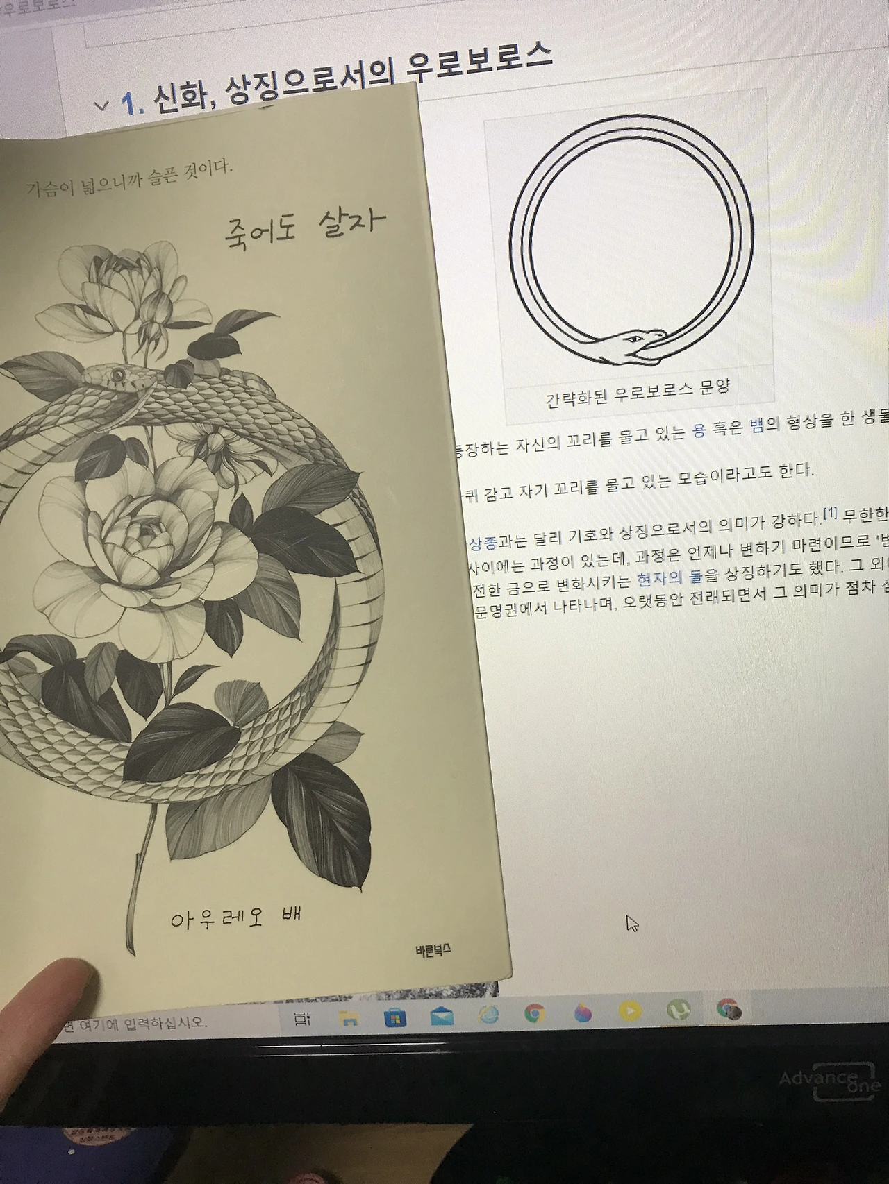 그렇게 삶과 죽음은 맞닿아 있습니다. 표지 이미지로 '우로보로스' 즉 자신의 꼬리를 주동이에 물고 있는 뱀의 형상을 선택한 이유가 여기에 있네요. 여는 글에서 저자 아우레오 배가 밝힌 재생과 영원, 자기 의존의 상징 외에도 우로보로스는 변화이자 완전함 그리고 현자의 돌을 상징합니다. 삶의 궤도 밖으로 투신하지 않는 한, 실수와 결핍, 고통을 당신의 힘과 매력으로 체화시킬 기회는 여전한 겁니다. 돌덩이와 납덩이를 금으로 변화시키는 연금술의 비기, 현자의 돌. 현자의 돌은 물질일 수도, 방정식일 수도 있습니다. 이 에세이집은 저자가 간직하고 있다 건네는 현자의 돌입니다. "죽어도 살자, 우리."라며 저자가 늘 말아 쥐고 있던 주먹을 펴 체온이 남아 아직 따뜻한 돌멩이 하나를 턱, 손에 쥐여주는 듯한 착각에 빠집니다.