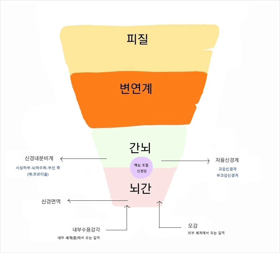 모든 것에 앞서, 뇌신경 체제의 이해에서부터 시작하기로 해요. 뇌의 작동 체계를 아는 것은 트라우마와 PTSD 이해를 위해 꼭 필요해요. 뇌는 반드시 순차적으로 발달합니다. 이러한 뇌의 신경 발달 체계에 대한 이해는 트라우마 치료에 있어서도 선행돼야 할 주요한 것입니다. 왜냐하면 트라우마 치료법이 효과가 있기 위해서는 적시에, 적합한 치료기법이 제공되어야 한다는 신경 순차적 접근법이 뇌신경 발달의 특성을 근거로 하기 때문입니다. 뇌의 아래쪽 시스템으로부터, 위로 올라가는 방향으로 이뤄지는 치료의 '순서'가 가장 중요하다고 볼 수 있지요. 신체 기반의 치료기법의 근거 또한 여기에서 비롯됩니다.