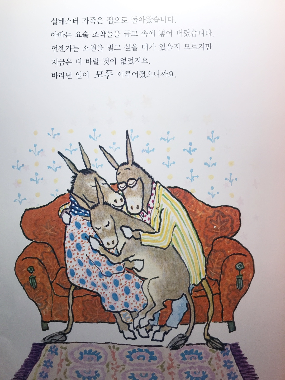 요술 조약돌을 손에 쥘 수가 없어, 본래의 모습으로 돌아가고픈 소원을 빌 수 없었던 바위가 된 실베스터.... 1년 후 다시 봄이 와, 실베스터의 실종을 슬퍼하며 피크닉을 나온 엄마 당나귀와 아빠 당나귀는 바로 실베스터가 변해버린 돌 위에 올라앉아 소풍 상을 차리게 되지요. 자칫 우스꽝스러운 이 상황이 안타깝기만 한 것은 작가의 이야기를 끌어가는 능력이라고 여겨져요. 이야기는 진지하면서도 과장되지 않은 적정 선에서 어린 실베스터의 무력함과 슬픔을 효과적으로 전달하여 줍니다. 이 순간 어린 독자들은 모두 손에 땀을 쥐게 될 거예요. 드디어 실베스터가 본래 모습으로 돌아와 깜짝 놀라 부모님과 포옹하는 순간, 긴장했던 아이들은 책 속 주인공과 함께 함박웃음을 짓고 손뼉을 칠 테고요.