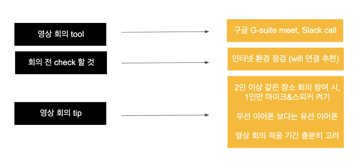 커뮤니케이션과 관련해서는 앞의 2개의 글에서도 정말 여러번 사용했던 표현인 '오버 커뮤니케이션' 에 대한 노력이 필요하다고 생각합니다. 원격근무에 있어 가장 중요한 것이 커뮤니케이션이기 때문에 반복적으로 말해도 모자라지 않다고 생각해요. '비대면'의 상황에서는 서로가 눈에 보이지 않고, 상대방의 몰입을 방해할 수 있으므로, 자신의 상태를 적극적으로 알리는 것이 중요합니다. '잠시 자리를 비운다, 잠시 쉬고 오겠다, 회의 중이라 회의 종료 후 해당 사안에 대해 의견을 내겠다, 잠깐만 기다려달라' 처럼요. 자리를 비울 때는 개인 휴대폰을 꼭 소지하고, 필요에 따라 자유롭게 전화할 수 있는 문화를 권장합니다.