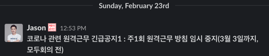 2월 22일 토요일 늦은 밤, 팀장 긴급회의가 소집되었습니다. 위험도가 높은 구성원을 비롯해서 전체 구성원이 원격근무를 기존 주1회 규칙과 별도로 적극적으로, 최대한 활용할 것을 알려주셨어요.