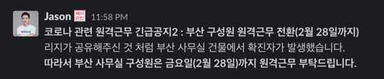 주말간 경북, 부산지역 코로나의 위험은 더 높아졌습니다. 하루사이 확진자가 계속 늘어났죠. 많은 구성원들이 우려의 목소리를 내었고, 일요일 밤, 리더 긴급 회의가 재소집됩니다. 이 회의 또한 원격으로, 슬랙 메신저를 통해 진행되었습니다. 두번째 리더 긴급 회의 후 부산 구성원 모두 일주일간 원격근무할 것과 서울 구성원도 적극적으로 원격근무를 사용할 것을 공지해주셨어요. 해당 공지 후, 고객과의 직접 통화가 필요한 영업, 운영 스쿼드 구성원이 사무실로 이동하여 착신전환 처리를 하기도 했습니다.(늘 수고가 많으신 대-고객 스쿼드 구성원 분들..)