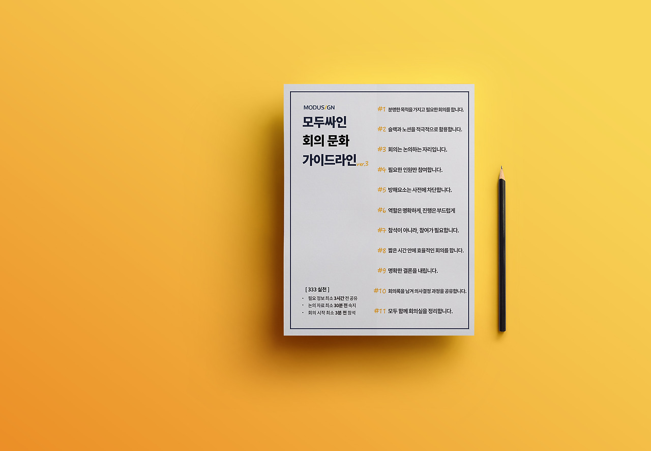 모두싸인은 회의를 적극 활용하고 있습니다. 누구나 회의를 주관하고 참여할 수 있는 준비가 마련되어 있습니다. 특히 작년 부터 서울 - 부산 - 재택근무의 3 spot 장소 근무가 일상화 되고 최근 코로나19 이슈로 multi spot 근무가 장기화 되면서 회의의 목적과 분명성은 더욱 강조되고 있습니다.