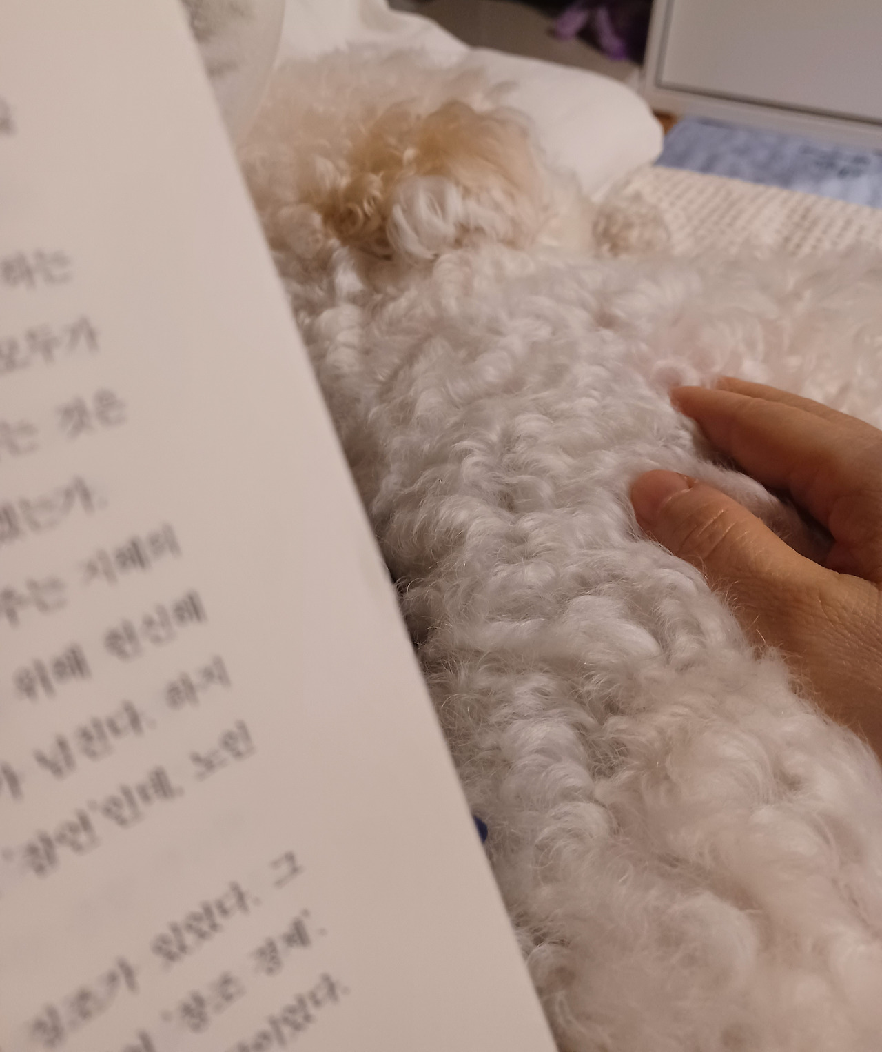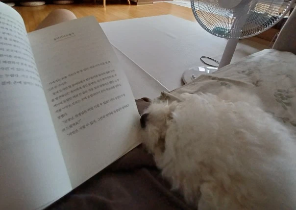 나는 책을 읽고 그 옆에 강아지가 기분좋게 엎드려 있는 모습을 상상했다.