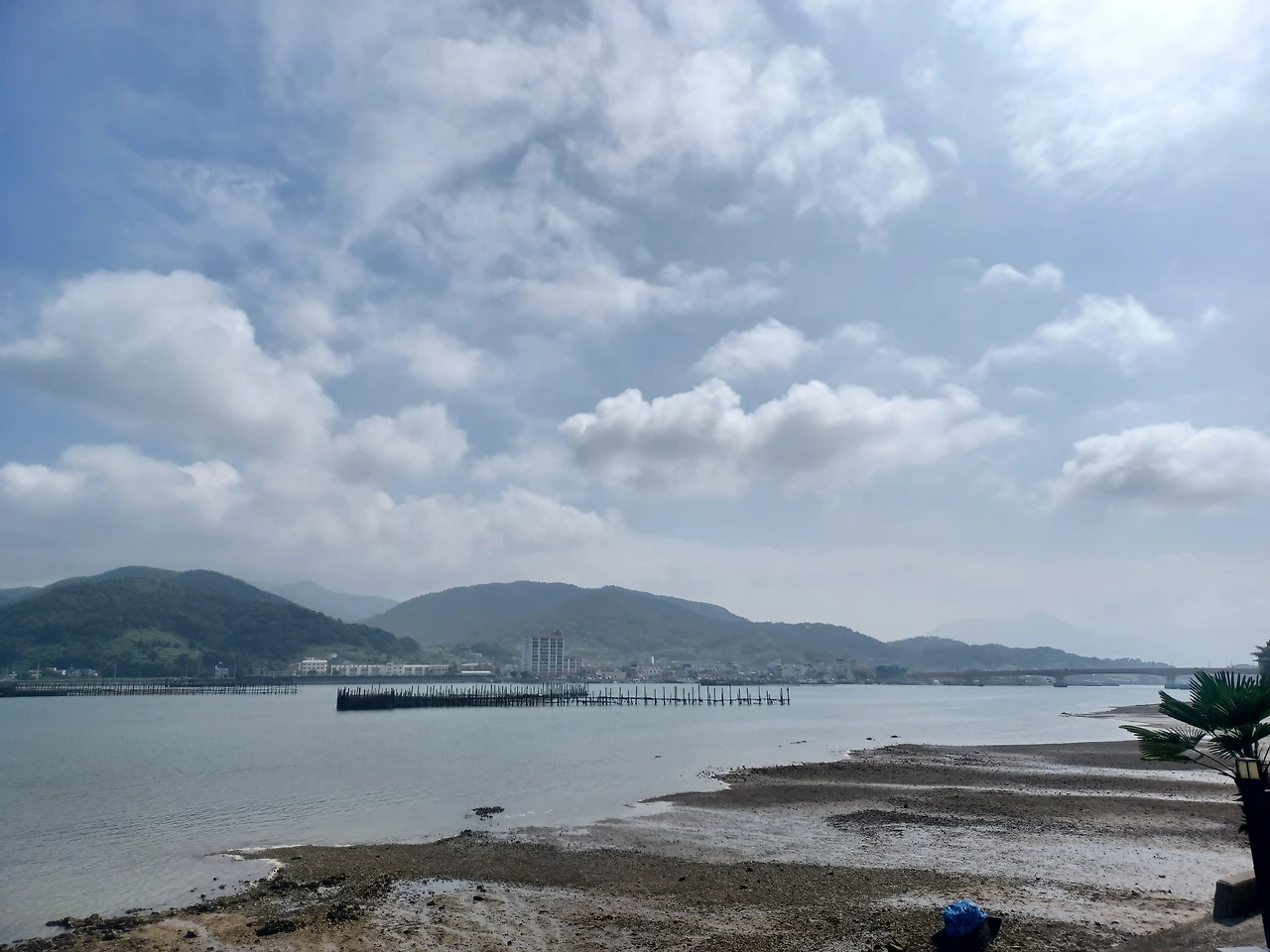늦은 오후까지 갯벌이 드러나 있는 바닷가. 멀리 죽방이 보인다.