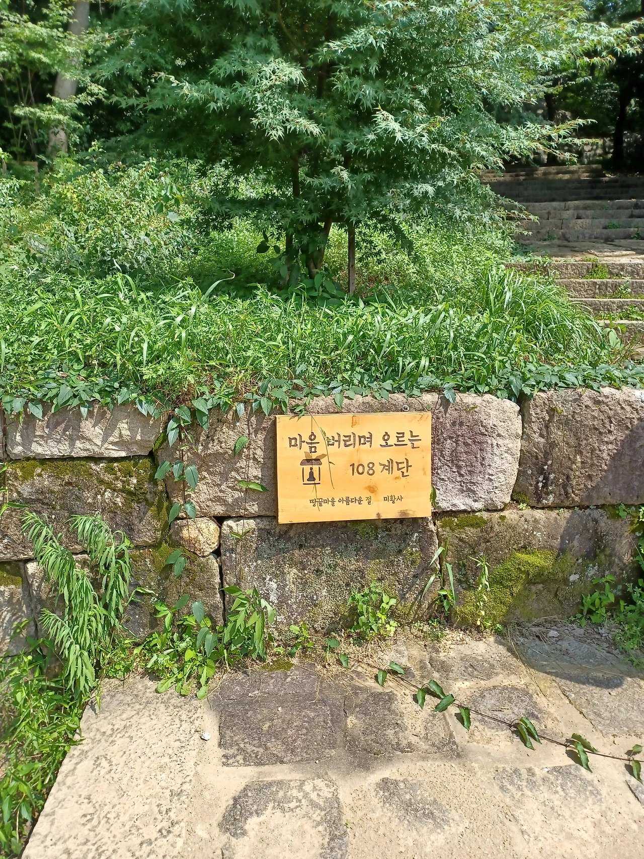 어쩐지 사진으로 본 사찰은 산 중턱에서 꼭대기에 가까웠는데 도착하니 산 입구 같아 이상하다 싶었다. 미황사 108 계단은 산과 어우러져 등산하듯 간격을 두고 이어진다. 산 입구에서 절이 있는 산 중턱까지 계단과 오르막이 반복되는데 산세가 아름다워 마음을 환기시키기에 적당하다.시작점에 적힌데로 계단을 오르며 마음을 비우다 보면 어느새 미황사 앞마당에 도착한다.