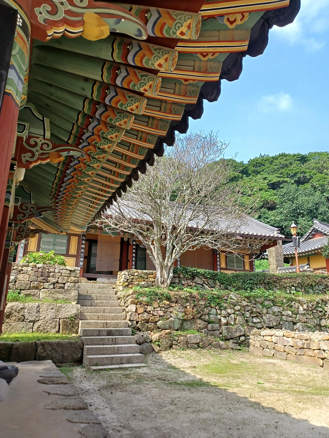 숲의 정취에 빠진 것도 잠시, 현판이 걸린 큰 문을 지나니 눈앞에 오르막 길이 등장했다. 108 계단이 그 위로 이어져 있었다. 그러고 보니 108 계단이 있다는 말을 들었던 것도 같았다. 미황사에 오기로 하고 친구만 믿고 있다 딱 한 번 어떤 곳인가 검색을 했는데 거기서 대웅전 천일 공사 소식을 접하고 108 계단이 아름답다는얘길 읽은 기억이 났다.