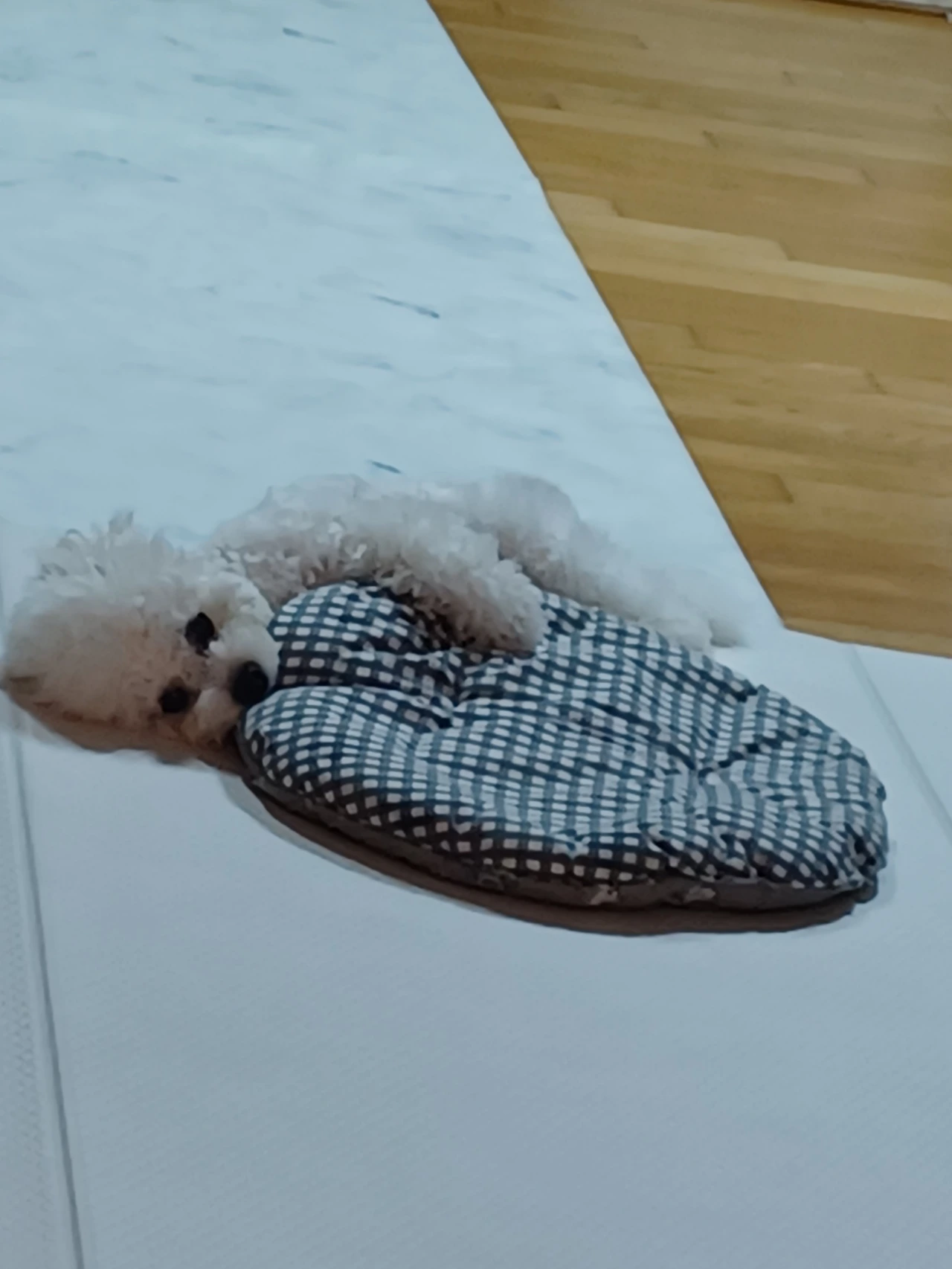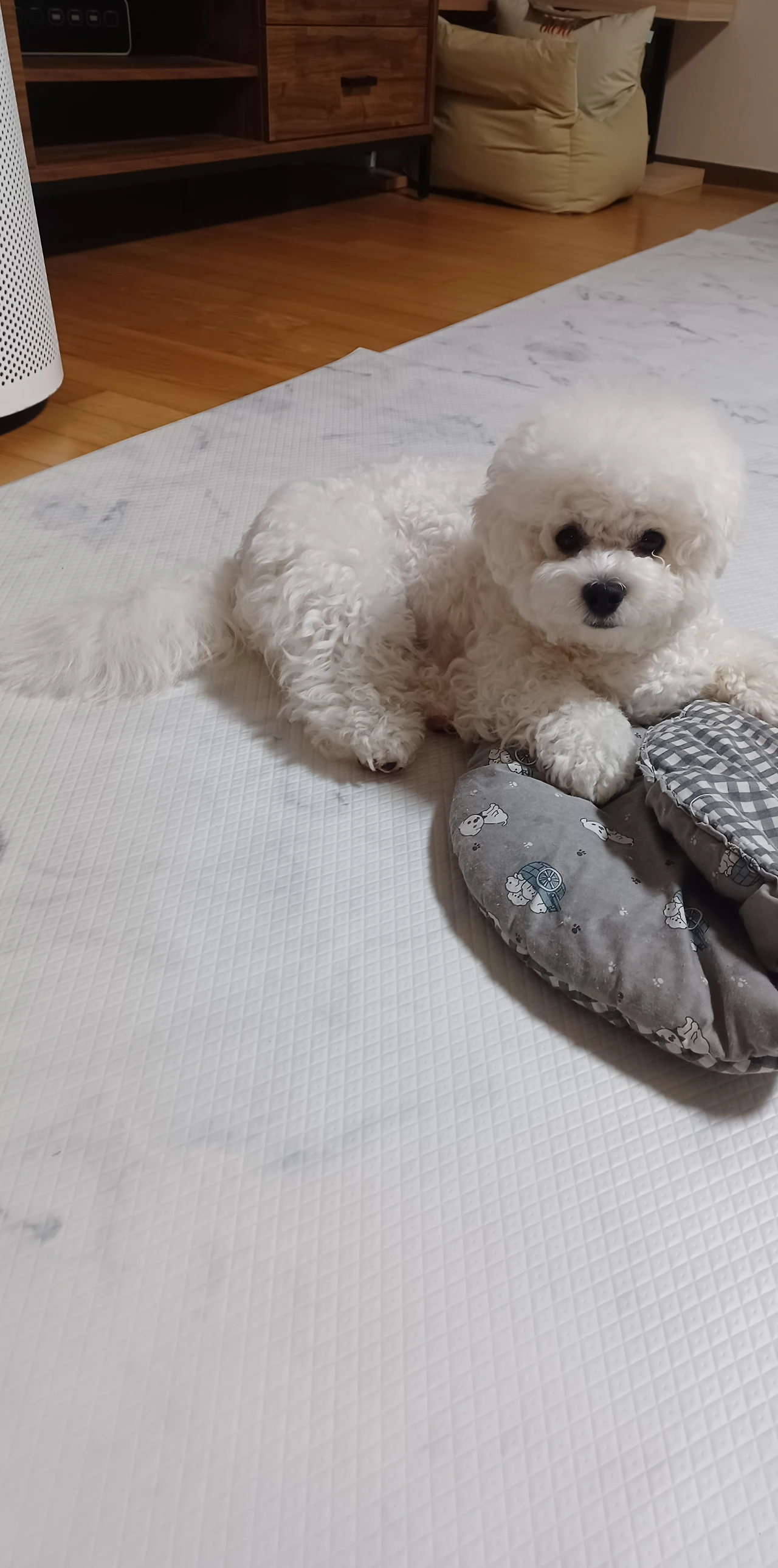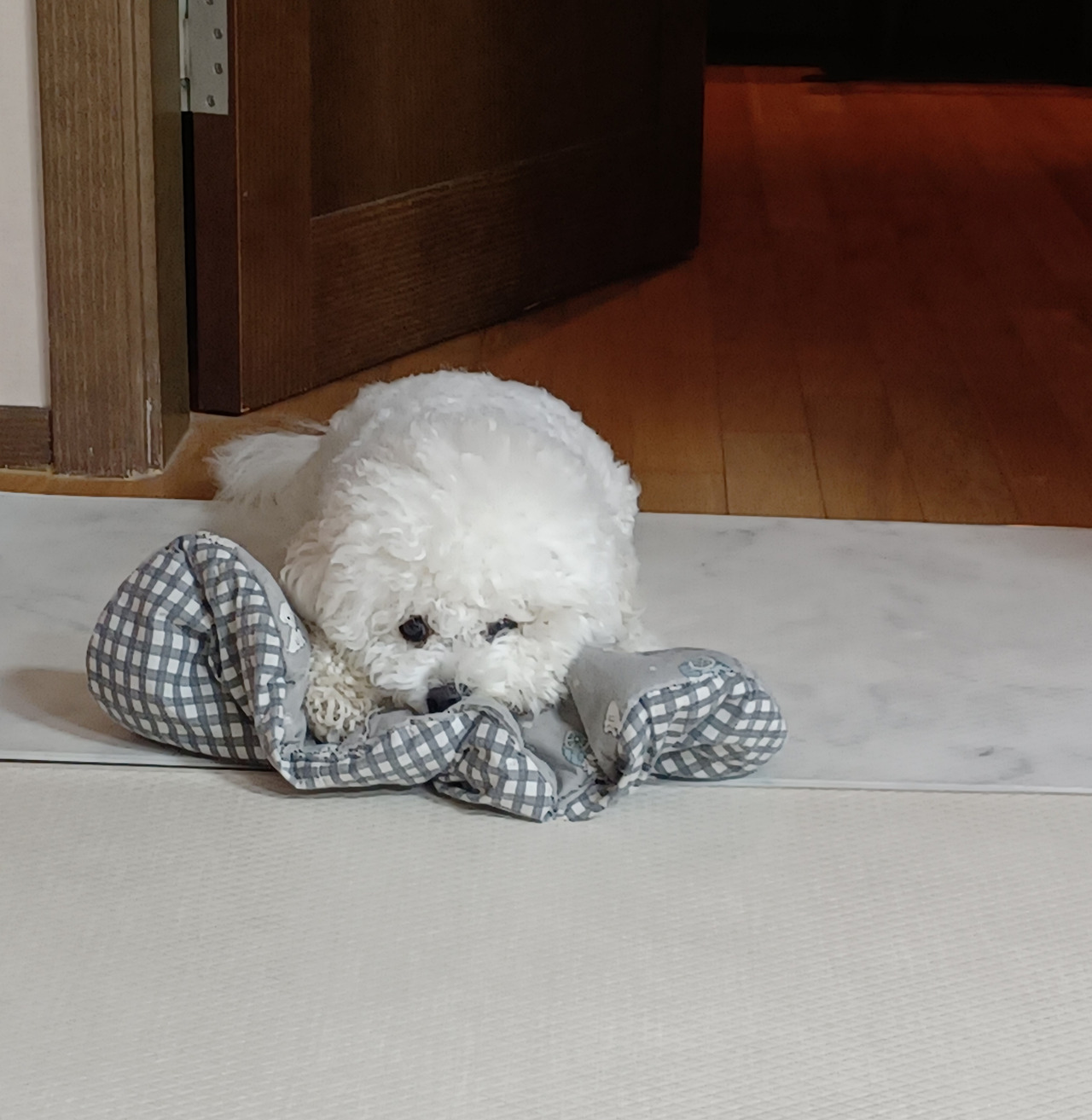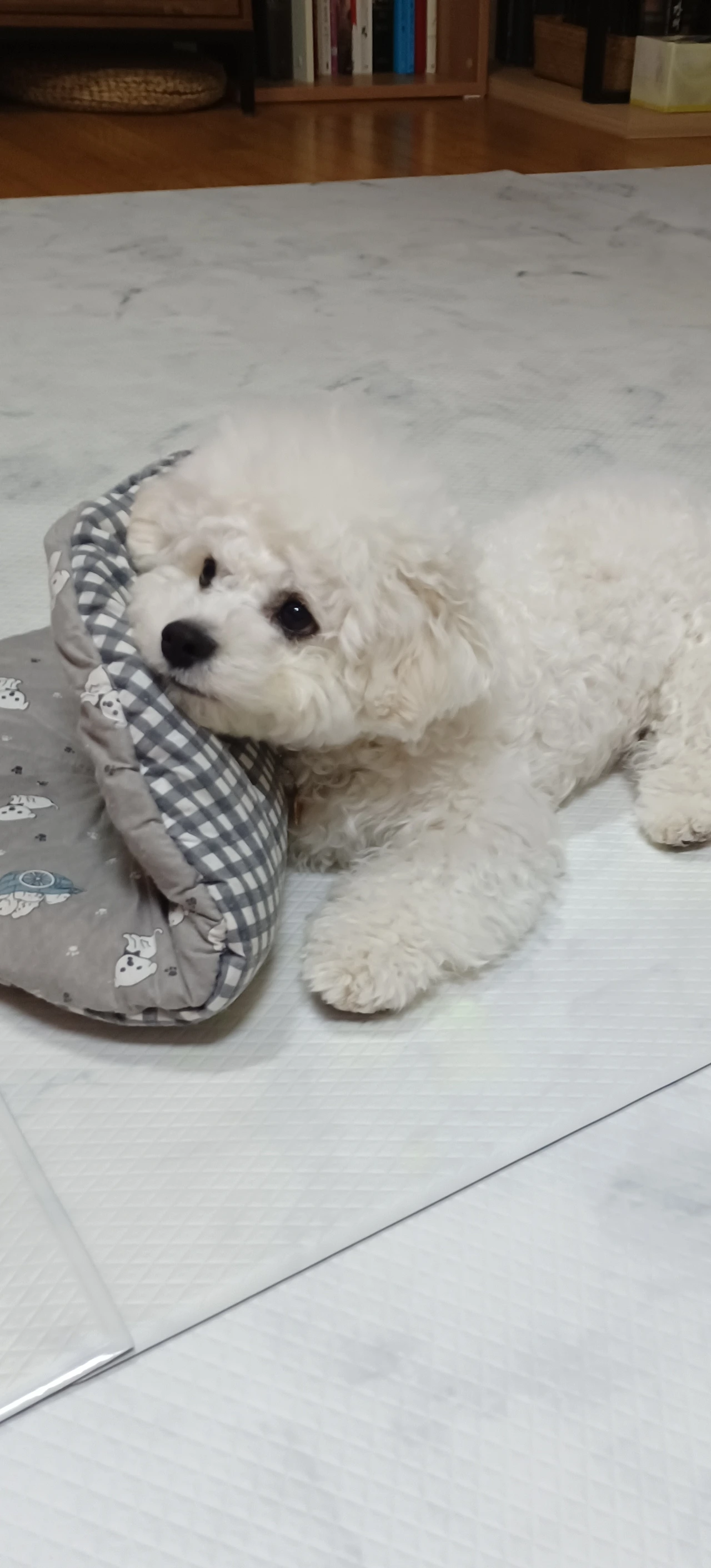 이갈이할 땐 이가 아프고 간지러우니 방석을 물고 엎드려 있나보다 했거든요.