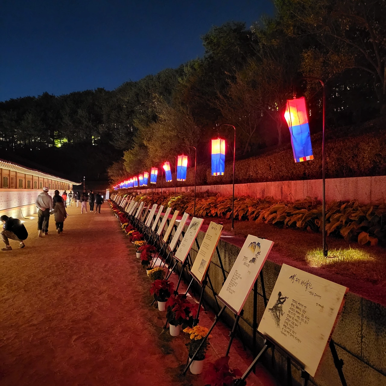 뒷마당으로 이어진 산길에는 청사초롱이 길을 밝히고 있었다. 소나무로 둘러싸인 이러타할 조명이 없는 곳을 청사초롱의 불빛을 따라 걷는 것은 하마터면 엄청 무서울 뻔했으나, 많은 사람들이 밀려 다니는 바람에 무섭지는 않았다. 인파 때문에 고즈넉함을 느낄 수 없는게 아쉬웠지만, 문득 이 사람들 모두가 좀비가 되어 산을 오르는 것 같은 상상에 재미있었다. 핼러윈 분위기를 고궁에서 느끼다니. 넷플릭스를 너무 많이 봤구나 생각하면서도 아이들과 좀비 흉내를 내며 사진도 찍었다. 언덕 산책을 마치고 내려와 어두운 행궁을 천천히 느끼다 밖으로 나왔다.