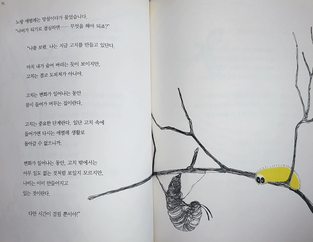 고치는 중요한 단계란다. 일단 고치 속에 들어가면 다시는 애벌레 생활로 돌아갈 수 없으니까. 변화가 일어나는 동안, 고치 밖에서는 아무 일도 없는 것처럼 보일지 모르지만, 나비는 이미 만들어지고 있는 것이란다.