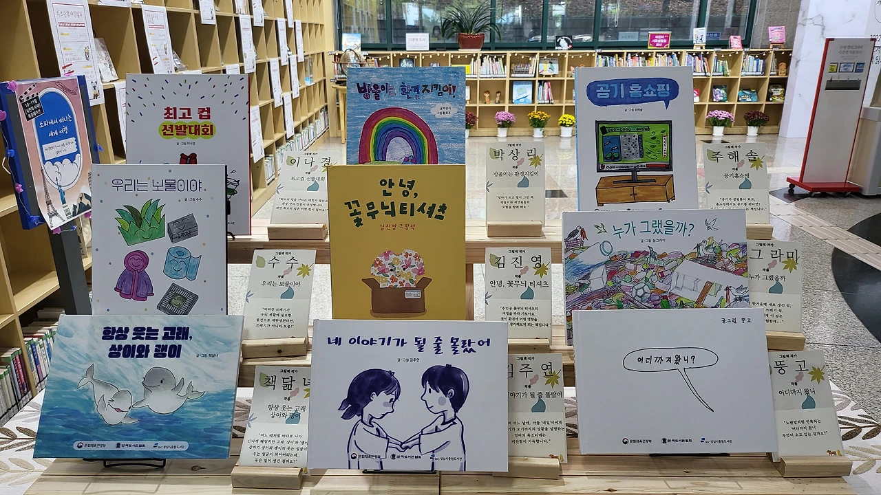그리고 몇 주 후, 출판기념회를 한다며 연락이 왔다. 평소 하고 있는 일과 시간이 맞물려 출판기념회에는 참석할 수가 없었다. 담당자는 도서관에 책을 2주 동안 전시하고 있으니 다른 분들의 작품도 볼 겸 방문하여 나의 그림책을 수령하라고 안내해 주었다. 오늘 나는 아이들과 도서관을 찾았다. 문을 들어서자마자 9명의 작가가 쓰고 그린 그림책이 우리를 맞이했다. 왼쪽 한 귀퉁이에는 내가 만든 그림책이 자랑스럽게 놓여있었다. 엉성한 서사에 미흡하기 그지없는 그림솜씨까지 쥐구멍에 숨고 싶은 심정이었지만 그래도 완성했다는 게 뿌듯했다. 중도 포기한 분들도 있었지만 끝까지 했다는 게 내 어깨에 힘이 들어가게 해 주었다. 아이들의 방학에도 불구하고 어찌 되었든 만들어 낸 나 자신이 기특했다.