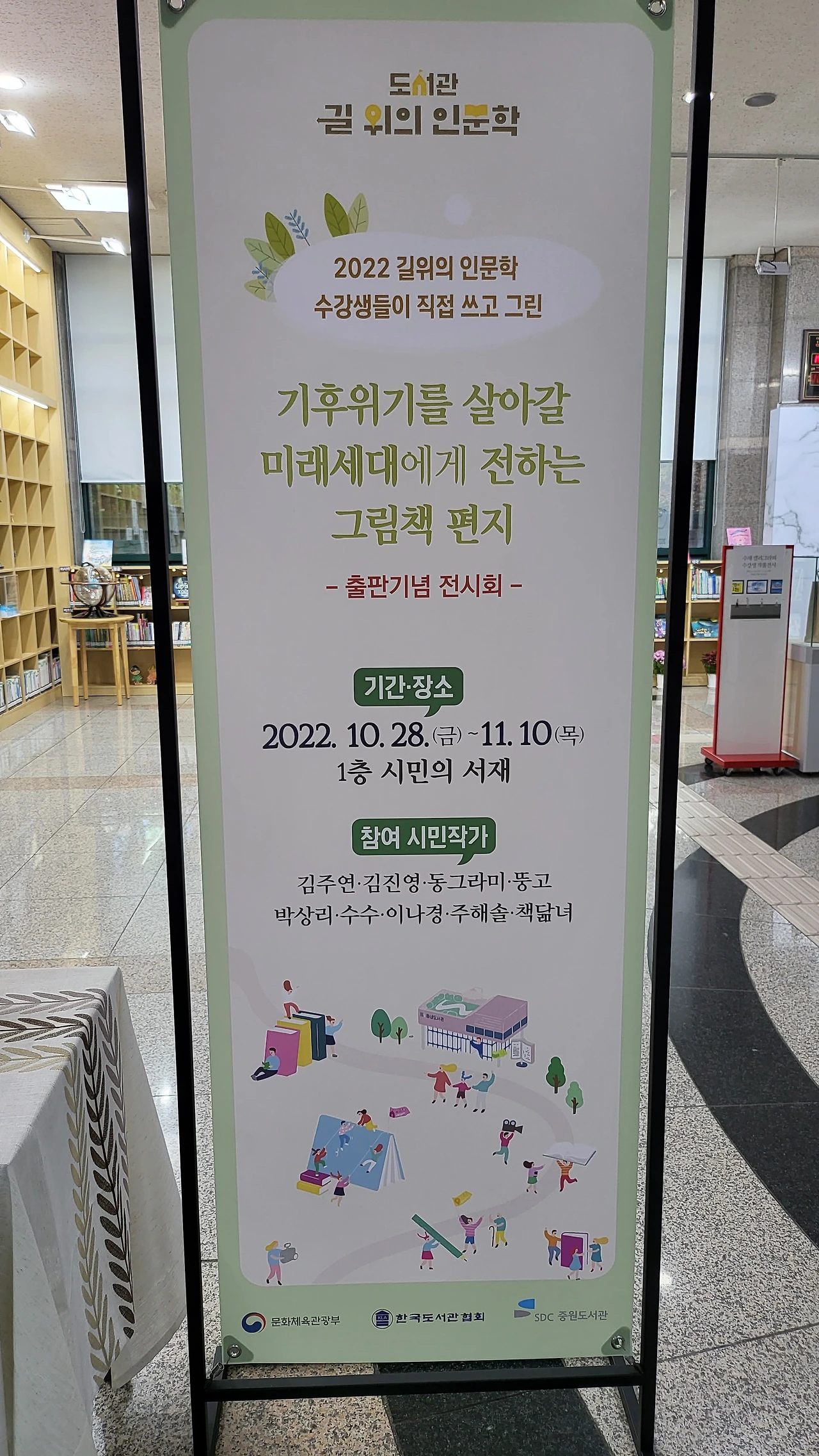 내가 그렇게도 듣고 싶었던 강좌는 그림책을 만드는 프로그램이었다. 문화체육관광부가 주최하고 한국도서관협회가 주최하는 2022년 '기후위기를 살아갈 미래세대에게 전하는 그림책 편지'라는 프로그램. 기후위기에 대한 인문학 강의를 듣고 자신의 생각을 그림책이라는 결과물로 만드는 시간이었다. 그림책 제작이라는 것 자체만으로도 나에게는 설레는 시간이었지만, 무엇보다 기후위기라는 주제로 생각을 나눌 수 있다는 게 좋았다. 다른 그림책 제작 수업과는 달리 이번 강좌에 선뜻 용기를 낼 수 있었던 것도 '기후위기'라는 내가 관심 있는 주제로 진행되기 때문이었다.
