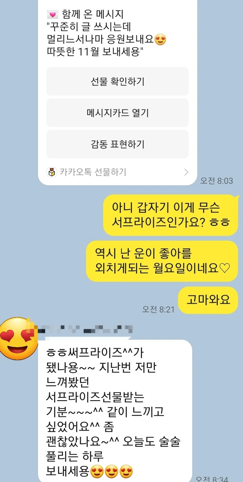 내가 쓰는 글이 누군가에게 닿기만 하는 것도 좋은데, 내가 쓴 글을 누군가가 응원해 준다는 사실이 이렇게도 행복할 줄이야. 덤으로 함께 붙어온 쿠폰도 물론 좋았지만, 아침부터 저의 하루에 스며든 한 문장이 하루 종일 웃게 해 주었습니다.