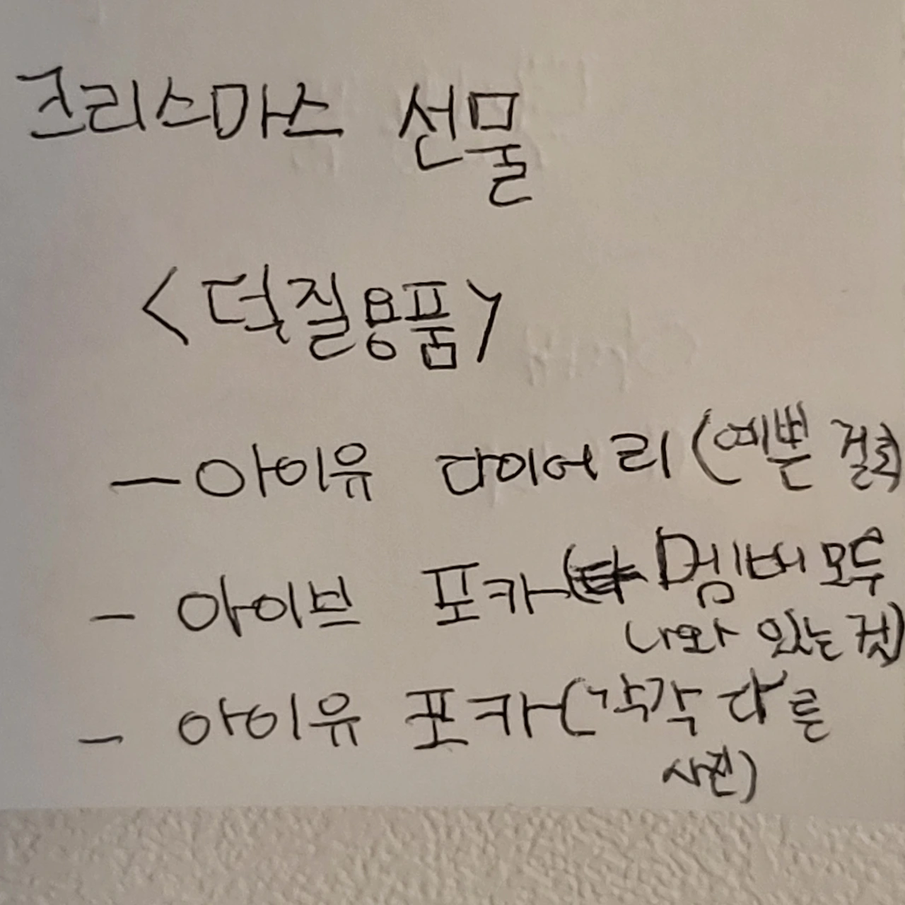 그.... 래..... 4학년 딸아.... 너 산타가 엄마 아빠라는 거 알고 있는 거니 모르고 있는 거니? 어쨌든 동생에게 중요한 포인트를 짚어줘서 고맙다. 엄마가 산타 할아버지에게 네 선물 목록 잘 전할게. 그리고 이번엔 저렴이로 골라줘서 고맙다고 산타할아버지가 전해 달래. 미리 메리 크리스마스^^