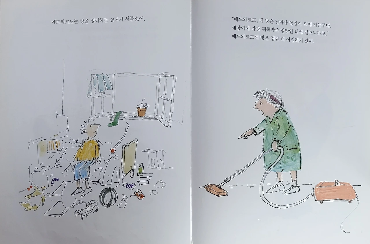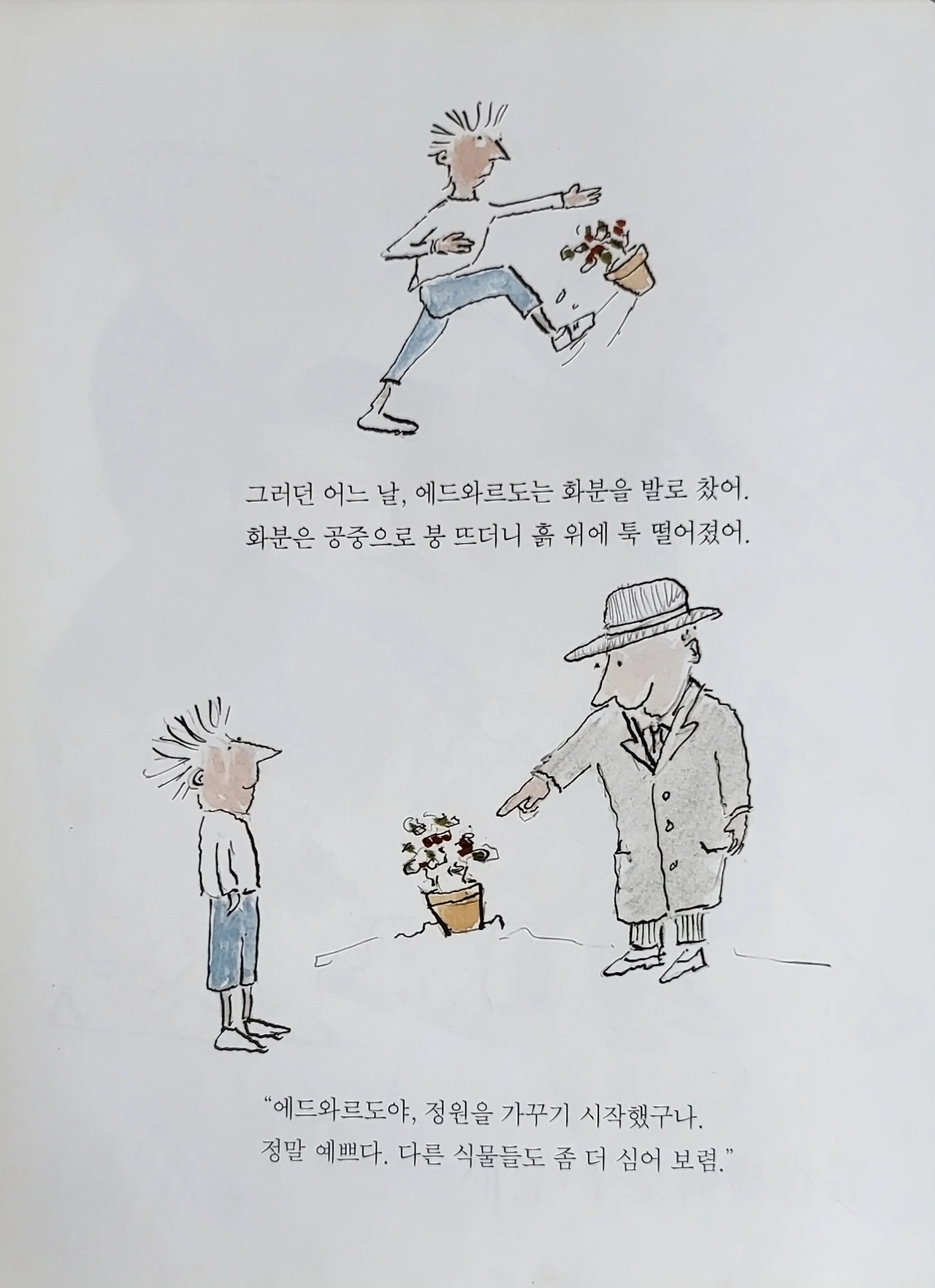 존 버닝햄의 그림책 『에드와르도 세상에서 가장 못된 아이』라는 책에는 말썽꾸러기 에드와르도가 나옵니다. 물건을 걷어차고요, 아주 시끄럽게 굴고요, 동생을 괴롭히고요, 방 정리는 도무지 하지 않는 말썽을 피우는 평범한 아이가 나옵니다. 어른들은 그런 에드와르도에게 세상에서 가장 버릇없고, 시끄럽고, 심술궂고, 뒤죽박죽 엉망인 녀석이라고 손가락질 하지요. 하지만 어느 날 에드와르도가 걷어찬 화분이 흙속에 콕 박힌 광경을 보고는 정원을 가꾸기 시작했냐며 예쁘다는 말을 건네지요. 그 말에 에드와르도는 정원을 진짜 가꾸기 시작해요. 그리고 꽤 멋있는 솜씨를 발휘합니다.