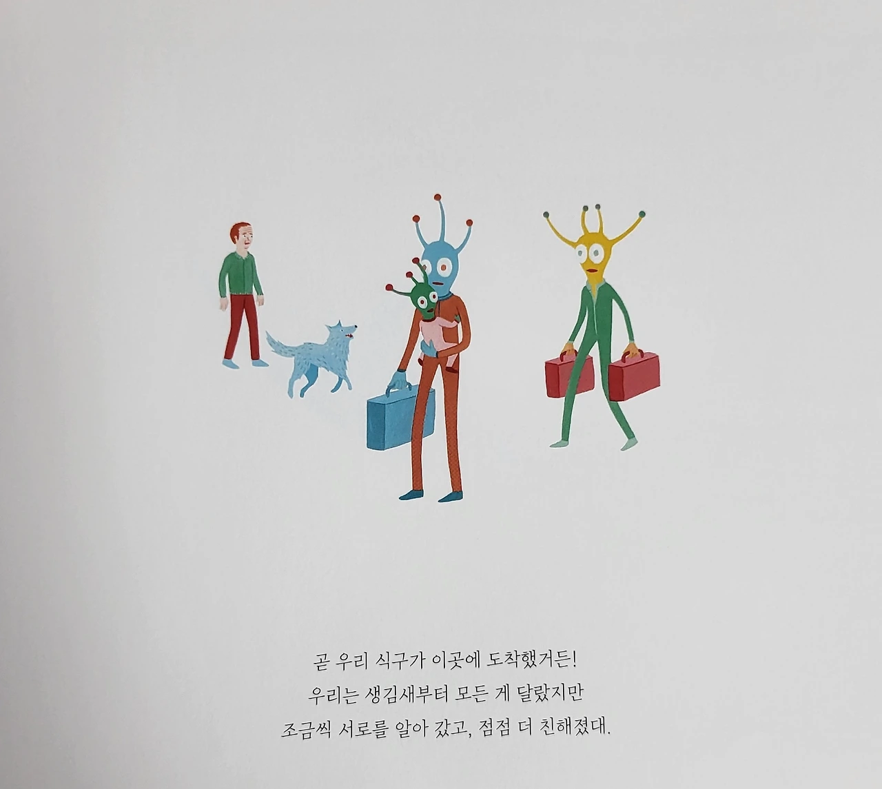 그림책 속 주인공 에메아저씨는 엄마와 머리 색깔도 눈썹색깔도 다르다. 갑자기 찾아온 외계인 가족들도 그렇다. 외계인 가족들은 에메아저씨와 다를 뿐 아니라 가족들 각각의 모습도 다르다. 머리에 난 뿔도 눈동자도 피부색도 모두 다르다. 가장 가까이에서 피를 나눈 가족들도 모습이 다르고 취향이 다르고 생각이 다른 법이다. 어느 누구나 고유한 존재니까.