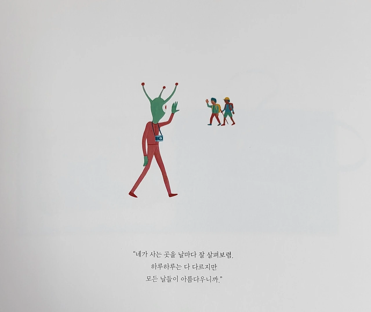 타인은 때때로 지옥일 때가 있다. 분명 그런 사람들도 그런 상황들도 존재한다. 하지만 타인 없이는 우리는 살 수 없다. 타인을 그저 타인으로만 보지 않았으면 좋겠다. 우리 삶의 장면의 일부를 차지하고 있는 소중한 구성원이라는 걸 기억하기를. 늘 우연히 마주친 모든 사람은 나에게 있어서는 외계인이다. 오랫동안 함께 지내온 가족들도 나의 세계 밖에 있는 외계인이고, 내 뱃속에서 나온 나의 자식도 그 속내를 알 수 없는 다른 차원에 존재하는 외계인이다. 그러나 우리는 같은 시간을 공유하고 같은 공간도 내어주며 서로의 소중한 것을 나누며 살아간다는 걸, 우리 모두가 기억하면 좋겠다. 그럼 우리의 모든 날들도 하나같이 다 아름다워지지 않을까.