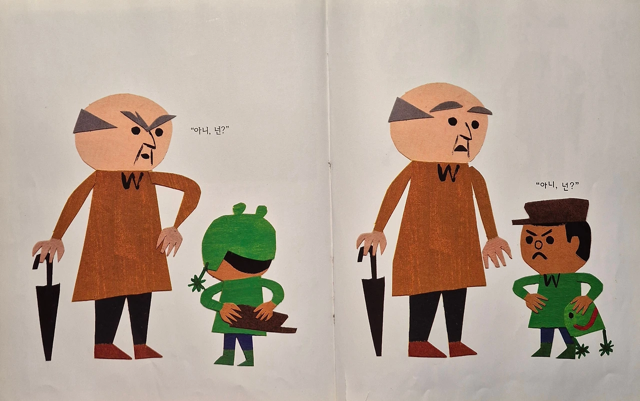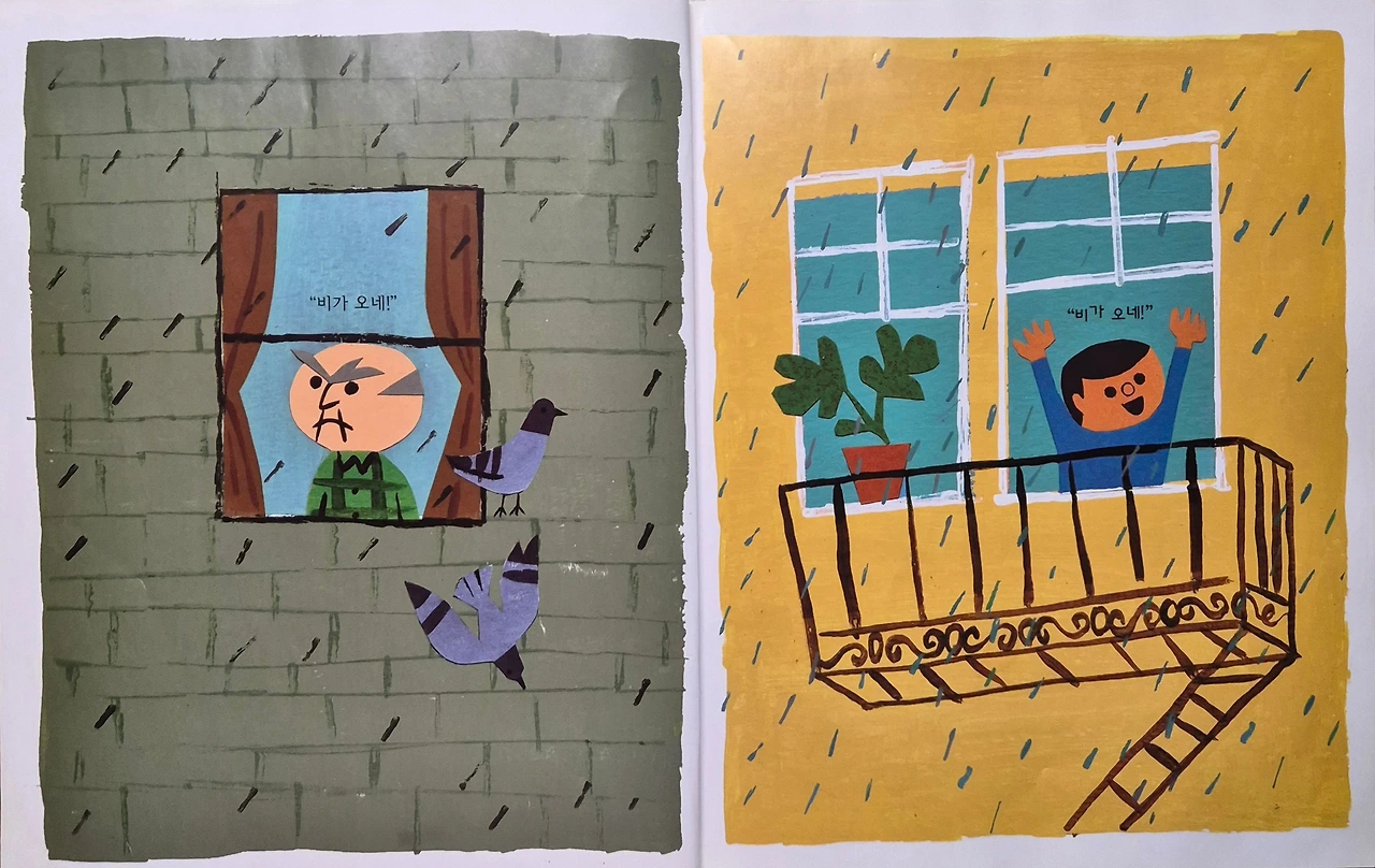 그 맛에 취해 <야호! 비다> 그림책을 열었다. 비 오는 날에는 비와 관련된 그림책을 읽어야 한다는 고정관념은 꽤 촌스럽지만 꽤 매력적이다. 책의 장면이 현실에서 이어져있어 꼭 책 속에 들어가 있는 듯한 느낌을 주니까 매력적일 수밖에. 비의 정취에 취해 꺼내든 그림책을 채 몇 장도 넘기지 않았는데 더 이상 그림책을 넘기지 못하고 멈춰 섰다. 할아버지와 아이가 똑같은 프레임 속에서 같은 말을 하고 있는 그 장면에서 멈춰 섰다. 둘을 같은 풍경을 보지만 다른 방향을 쳐다보며 같은 이야기를 다르게 하고 있었다.