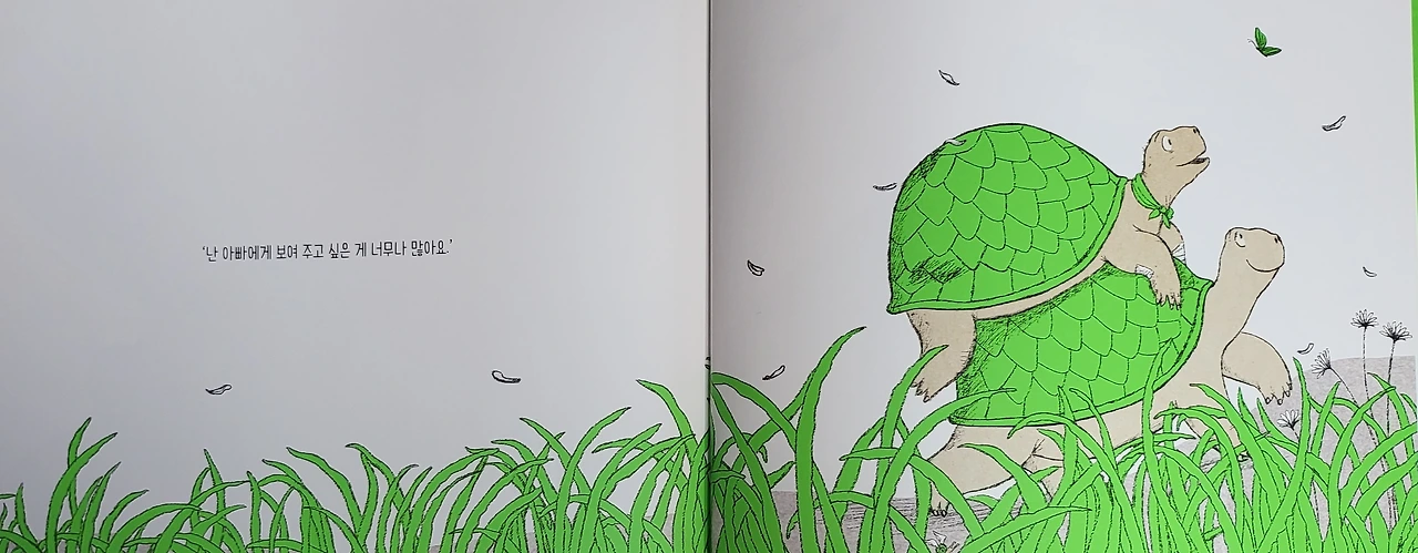 아직은 아이를 나의 등에 태우고 있지만, 아직은 내가 아이의 등에 올라타지는 않았지만, 또 영원히 등에 올라타지 않고 살아가는 게 나의 인생 목표이기도 하지만, 언젠가는 늙고 병들어 힘이 없어지면 나도 아빠 거북처럼 아이의 등에 기대게 되겠지. 그때 더 많은 것들을 함께 보고, 함께 들을 수 있도록, 지금 나의 아이와 같은 곳을 보고, 나의 마음을 표현하고 또 적당한 거리에서 그저 기다려주어야겠다. 아빠 거북이 서투르지만 인내와 용기로 아기 거북이 일어서기를 기다렸던 것처럼 나도 그래야겠다.