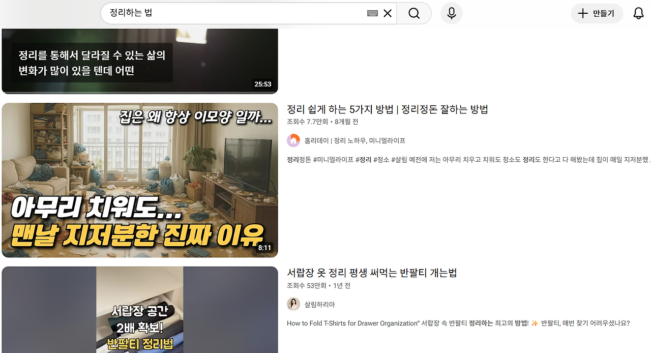 답답한 마음에 유튜브에 정리하는 법을 검색해 봤다. 놀랍게도 세상엔 정리전문가라는 직업이 있었다. 대기업 회장님 집도 정리해 봤다는 정리컨설턴트부터 풍수학적으로 집정리를 코칭해 주는 풍수 선생님까지, 모두가 대한민국 일타 정리전문가라는 타이틀을 달고 있었다. 선생님들의 도움을 받아 티셔츠 효율적으로 개는 법 같은 걸 배워 옷장을 정리하기도 했지만 오래가진 못했다. 요요현상으로 줄어들었던 살이 서서히 다시 불어나듯 한 번 정리했던 곳들은 시간이 지나면 서서히 원래의 지저분한 상태로 돌아왔다. 수납에도 관성의 법칙이 존재하는 것 같았다.