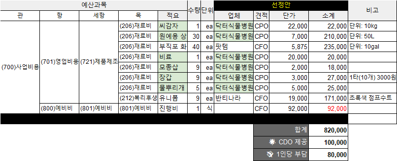 - CDO (Chief Dentist Officer - 치과의사) 형규님은 바쁜 업무로 인해 미리 잦은 불참을 예고했고 대신 비용을 조금 더 지출하기로 했다.