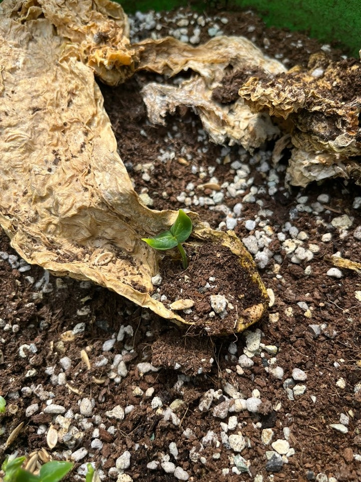 하지만 모든 일에는 양면이 있다. 지금부터는 다시 자신감을 갖고 그로 인한 작은 기적을 소개하고자 한다. 투기꾼에 의해 버려진 노각은 장마가 끝난 8월의 태양 속에서 바짝바짝 마르더니 급기야 형체를 알아볼 수 없게 됐다. 그렇게 마지막 오이는 점점 잊히는가 했는데... 어느 날 그 미라 같은 것 틈에서 싹이 올라왔다. 처음엔 잡초인가 싶었는데 뾰족하고 빳빳한 것이 다른 잡풀들과는 근본이 달랐다. 몇 달 키워봤다고 안면이 트인 것이다. 혹시나 하는 마음에 사진을 찍어 확인해 보니 네이버 스마트렌즈도 오이임을 확인해 줬다. 친자 확인이라도 받은 마음이었다. 일전에 제멋대로 엉켜 허덕이는 오이 덩굴을 다듬어주며 사람이 손을 대지 않던 시절엔 어떻게 살았지? 싶었는데 눈으로 직접 확인했다. 대단한 놈들..