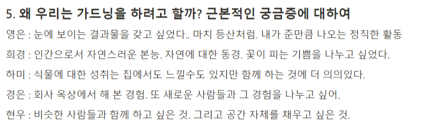 5명으로 시작한 을가클에는 지금 10명이 조금 안 되는 사람이 있다. 마늘, 양파로 시작한 을가클 마당엔 지금 오이, 고추, 참외, 배추, 감자, 메밀 등의 작물과 바질, 레몬밤, 로즈마리, 고수 같은 허브류의 식물이 함께 자라고 있다. 사람과 식물 모두 조금씩 같으면서 조금씩 다르다. 우리는 매주 한 번 꼴로 돌아가며 을지로 작업실 콥랩을 방문해 물을 주고 마당을 정돈한다. 그리고 비치된 일지에 기록을 남긴다. 한 달에 한 번은 다같이 모여 책을 읽고 각자의 생각을 나누는 독서모임을 진행하기도 한다. 그렇게 우리는 식물을 매개로 한 곳에 모여 책을 읽거나 영화를 보고 때로는 여행을 떠나기도 하는 그룹으로 1년의 시간을 보냈다.