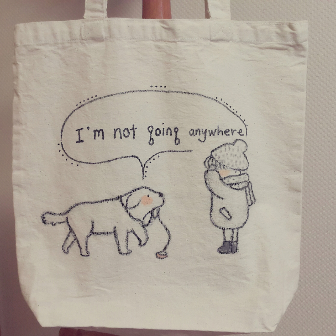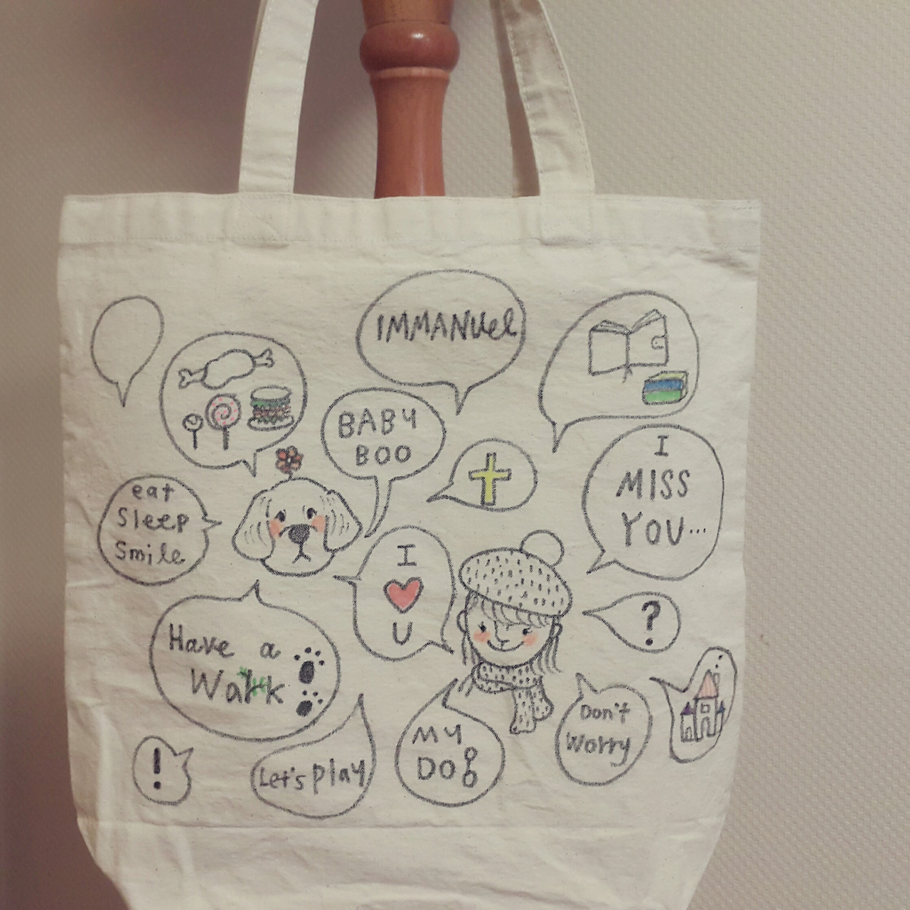 에코백 뒷면에는 나와 남자친구의 이야기를 담고 싶었다. 말풍선 가득한 가운데 멍뭉이와 꼬맹이가 얼굴을 빼꼼 내밀고 서로를 바라보는 느낌으로