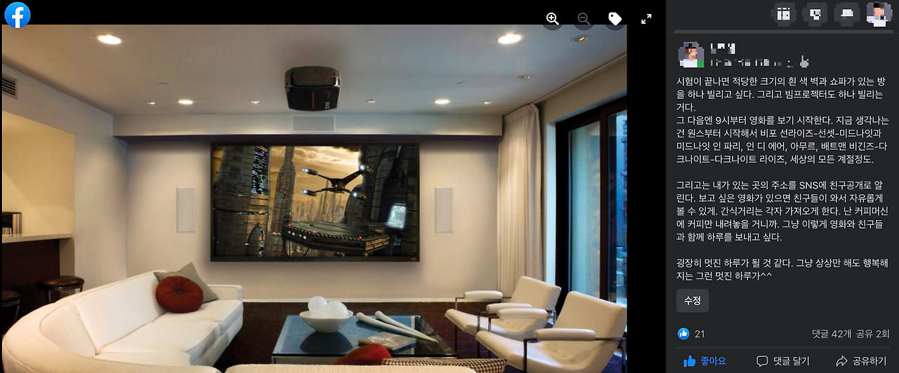 SNS에 적어 둔 이 메시지가 제가 인생을 살아가는 즐거움을 모두 담고 있다 생각합니다.