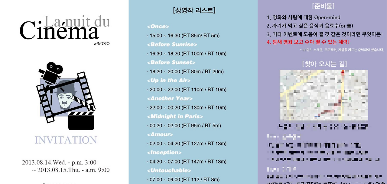 다들 잘 아시겠지만, 시험기간만 되면 공부는 안되고 이상하게 Creative 하고 재밌는 생각들이 마구 떠오릅니다. 적어도 그 순간에는 그게 제일 재밌는 생각이라 굳게 믿죠. 그때가 그랬습니다. 시험공부는 하기 싫고, 그냥 흰색 벽이 있는 방을 하나 빌려 하루 종일 영화나 보고 싶더라고요. 그래서 언젠가 해봐야지라는 생각으로 SNS에 그 생각을 올렸죠. 근데 생각보다 그런 하루를 꿈꾸는 사람들이 많더라고요. 그때, 이거 재밌겠다는 생각이 들었고, 마침내 생일이 공휴일이니 전날부터 밤새 영화를 보더라도 문제가 없겠다 싶었죠. 그래서 한 번 해보기로 했어요. 많은 분들의 도움을 받아 판을 짜고, 하나하나 준비했습니다. 그리고 마침내 지인이 운영 중인 게스트 하우스에서 2013년 8월 14일 오후 3시부터 8월 15일 아침 9시까지 보고 싶은 영화를 주야장천 보는 무비나잇을 열었습니다.