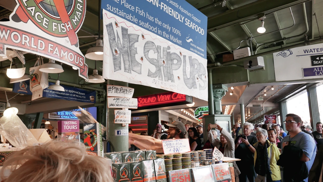 그렇게 꽃과 과일의 향기, 상인들의 활기찬 에너지에 취해 시장을 돌아 다니다 어느 수산물 매대 앞에 멈춰 섰다. 파이크 플레이스 마켓 최고의 명물, Pike Place Fish Co.매장 앞에 도착했다!