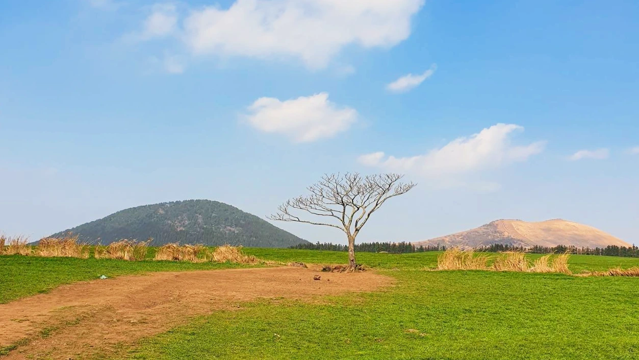 새별오름 가는 길에 들른 나 홀로 나무는 포토스팟으로 워낙 유명한 관광지다. 너른 들판에 나무 한 그루가 서 있고 그 뒤로 새별오름과 이달오름이 배경으로 펼쳐지는 곳이다. 가보면 저절로 사진을 찍고 싶어 지는 명소다. 성수기에는 입구 쪽 도로에 차들이 하도 많아 통행이 어렵다고 한다. 줄 서서 사진 찍으려는 사람이 많아서. 이런저런 이유로 사람들의 발길이 뜸한 때 가서 다행이었다. 바람이 세차게 불었지만 그마저 아름다운 풍경의 일부였다.