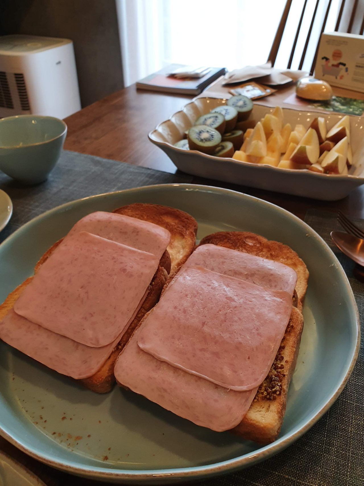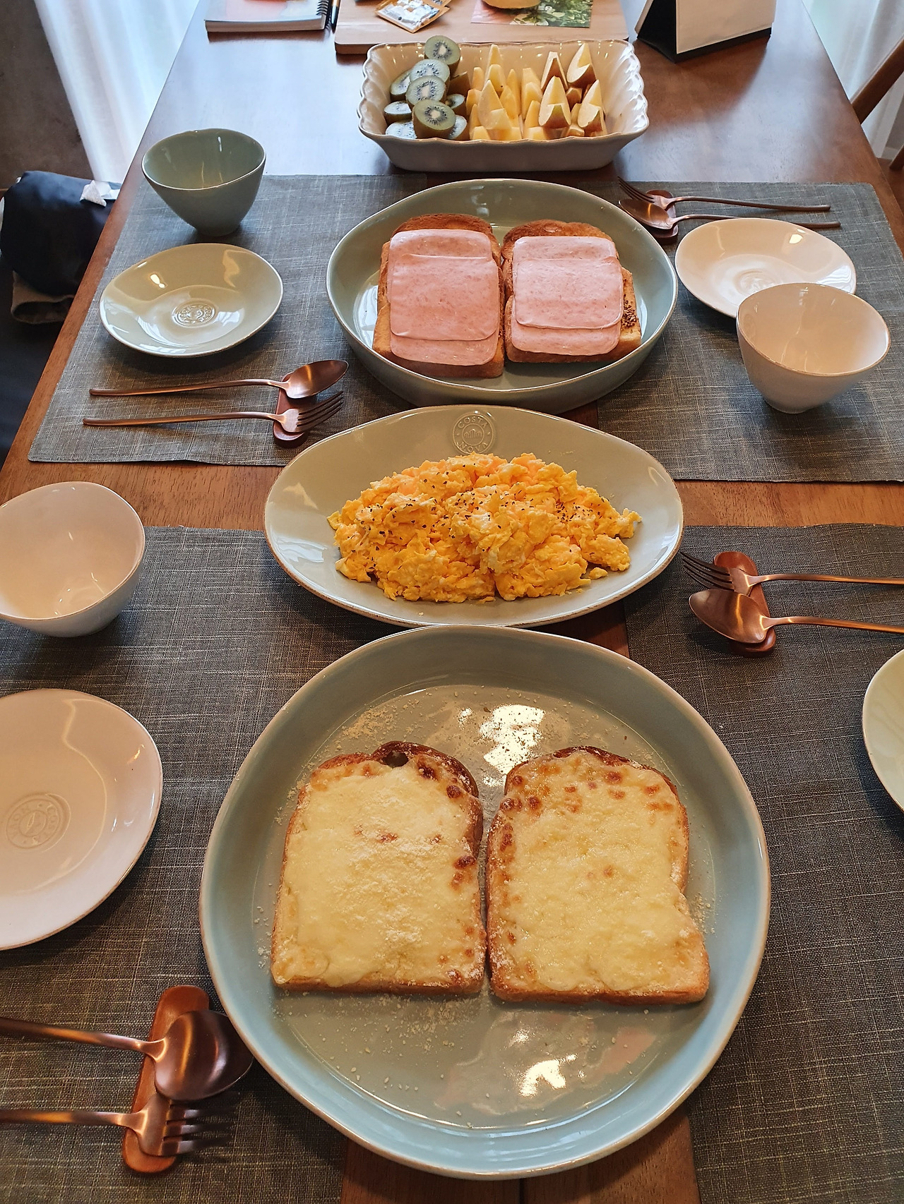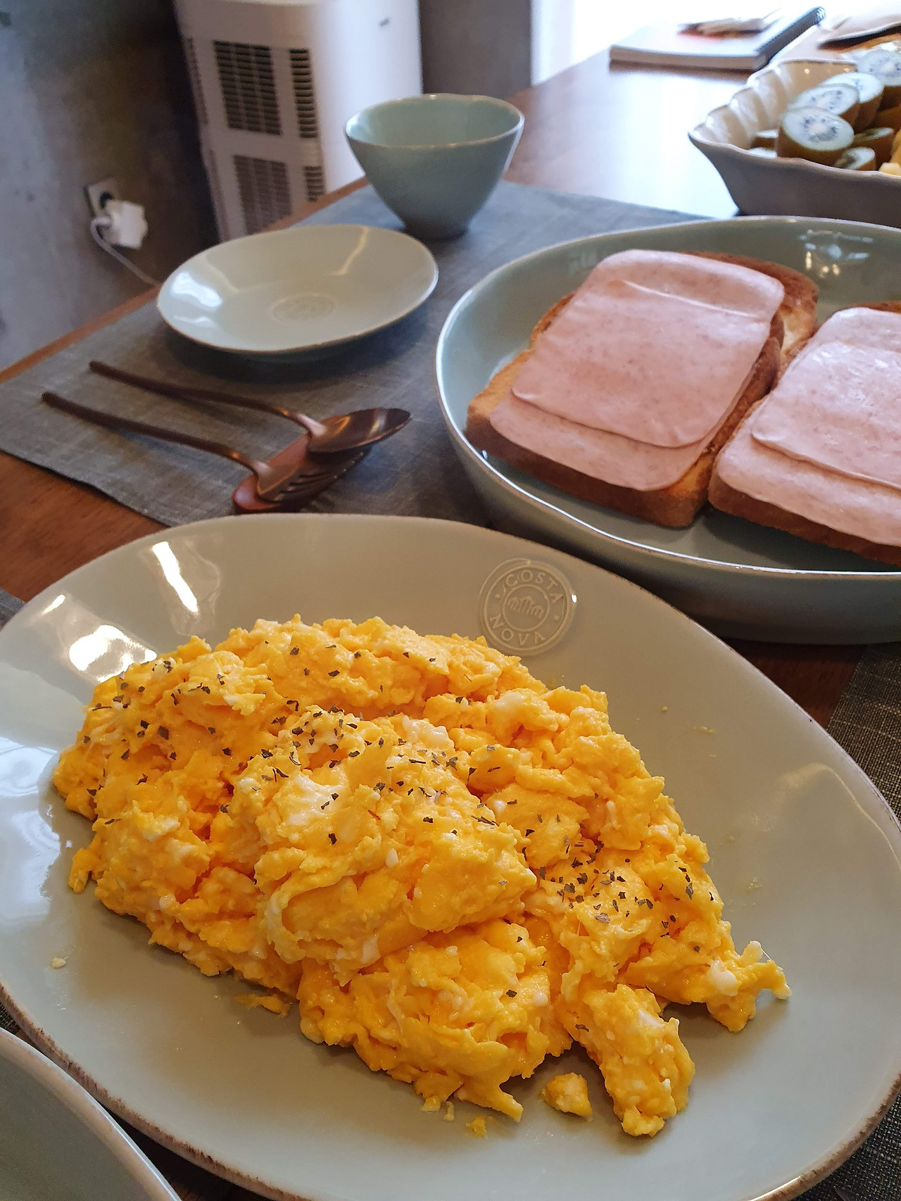 아침에 일어나서 마른빨래를 게고, 아침 요리에 필요한 것들을 바리바리 챙겼다. 양옥집에 들어가서 BGM 틀고, 조금은 낯선 주방에서 하는 다섯 명의 아침을 준비하는 건 생각보다 즐겁고 새로운 경험이었다. 스크램블드 에그에 계란 10개(버터 조절하는 것도 힘들었지만, 조리하는 게 생각보다 엄청 힘들었다), 토스트 6조각, 알아서들 잘라먹으라고 불친절하게 그냥 내보냈다. 과일도 손이 더디니 시간이 오래 걸렸다. 그래도 다 차려놓고 보니 보기 좋더라. 이렇게 같이 먹으니 더 좋더라.